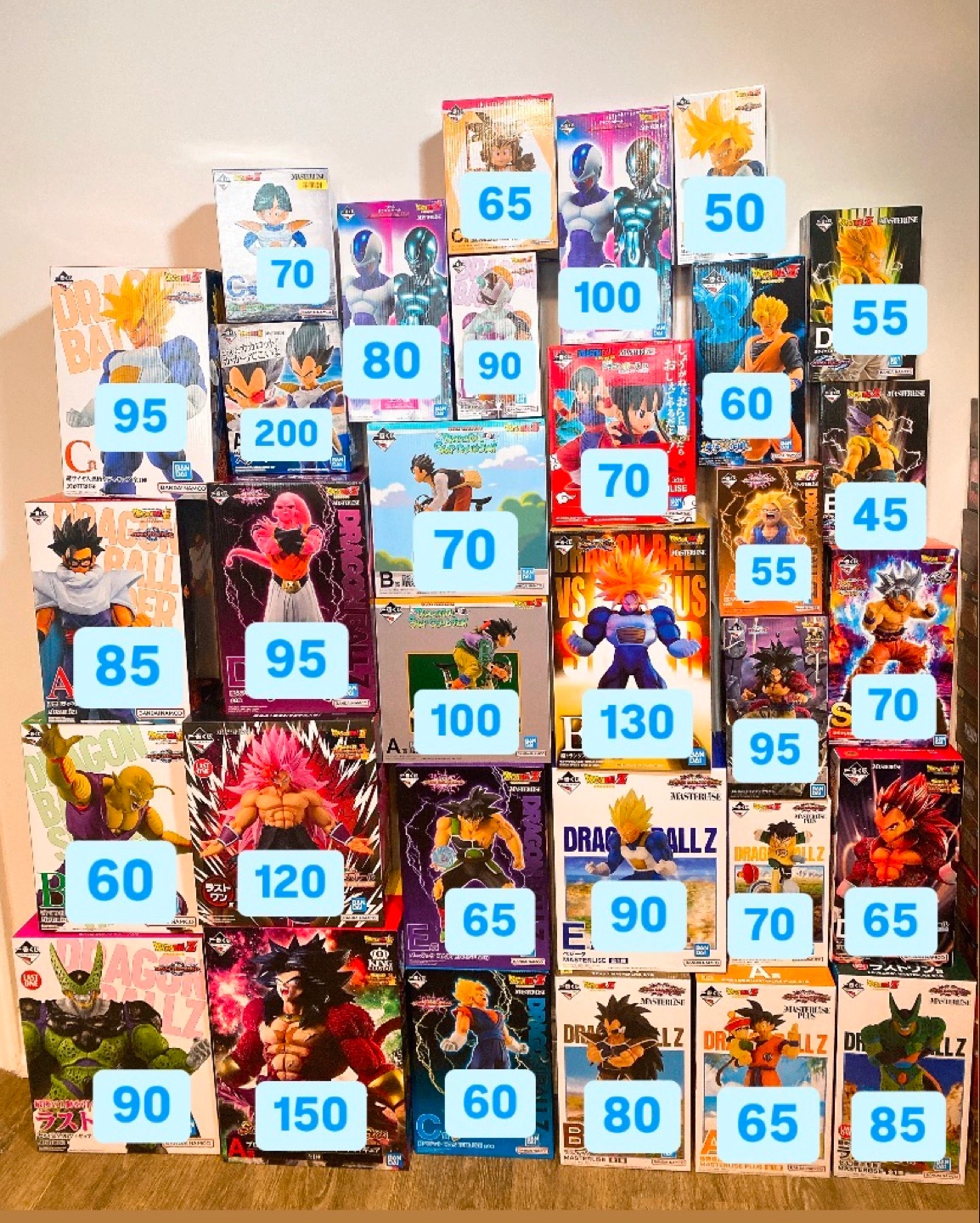 Large collection of Dragon Ball Z figures. Many different characters and sizes. Figures keep sealed in boxes. Prices vary per figure listed on photo 2. Starting from 45.