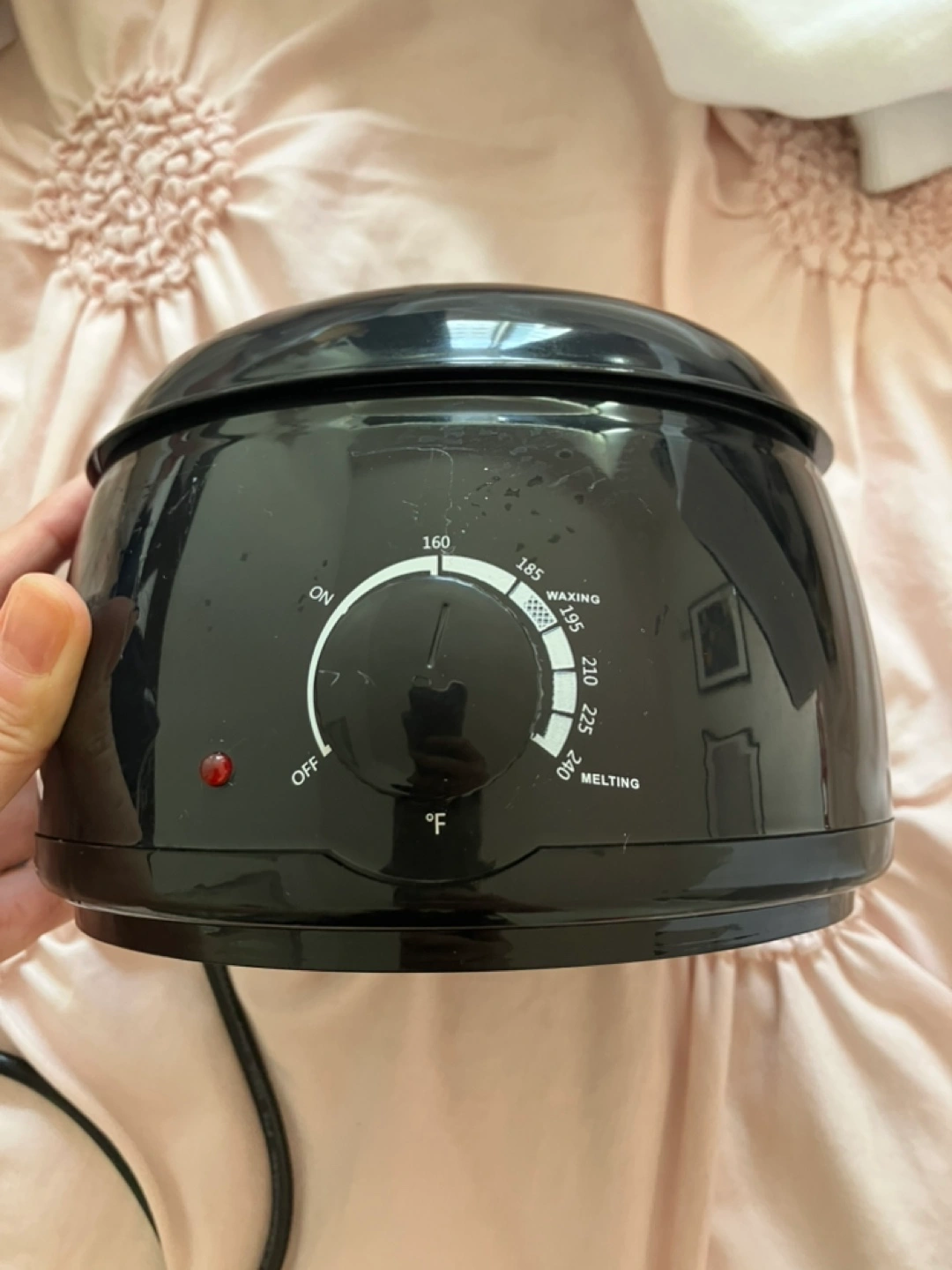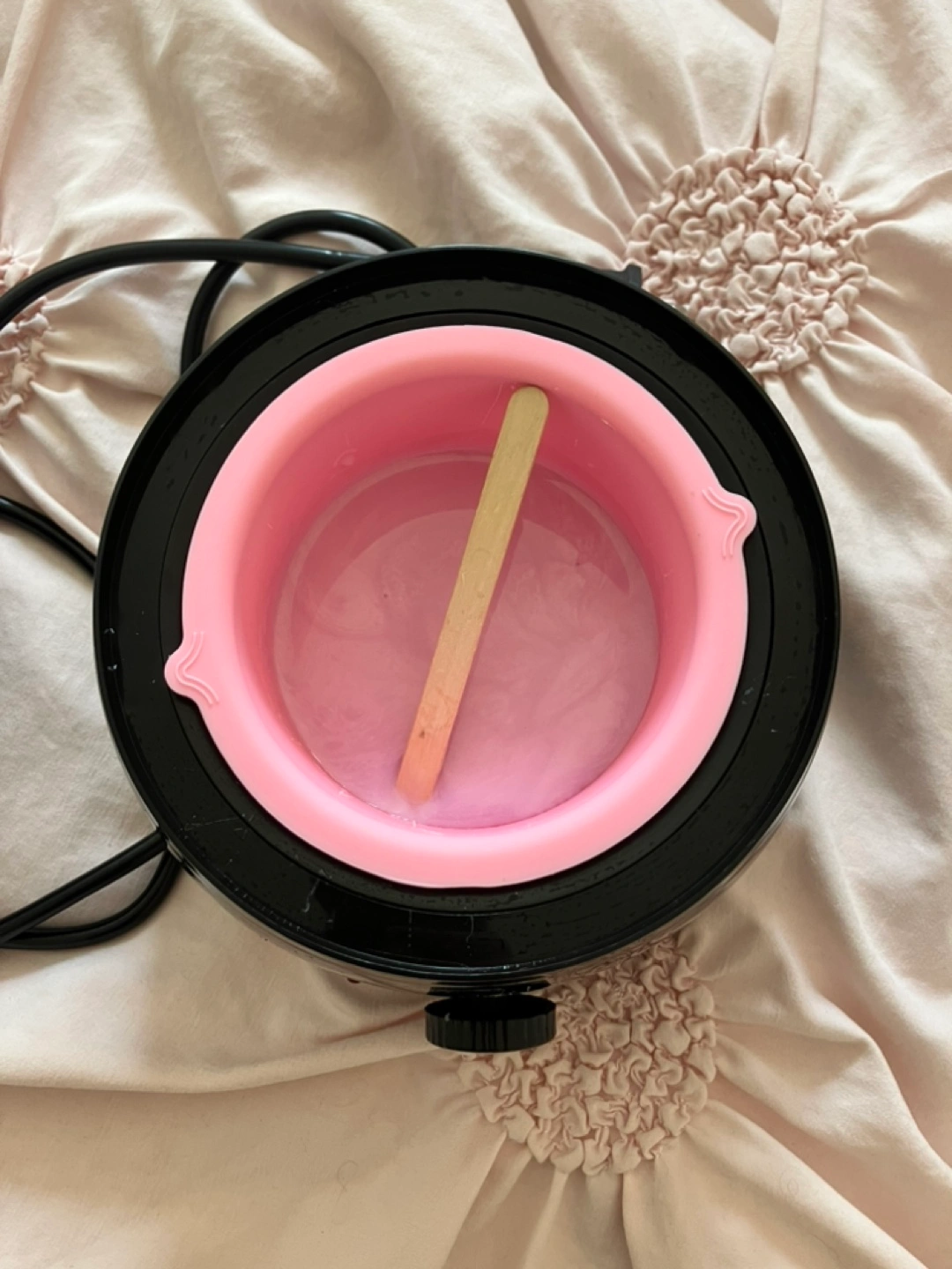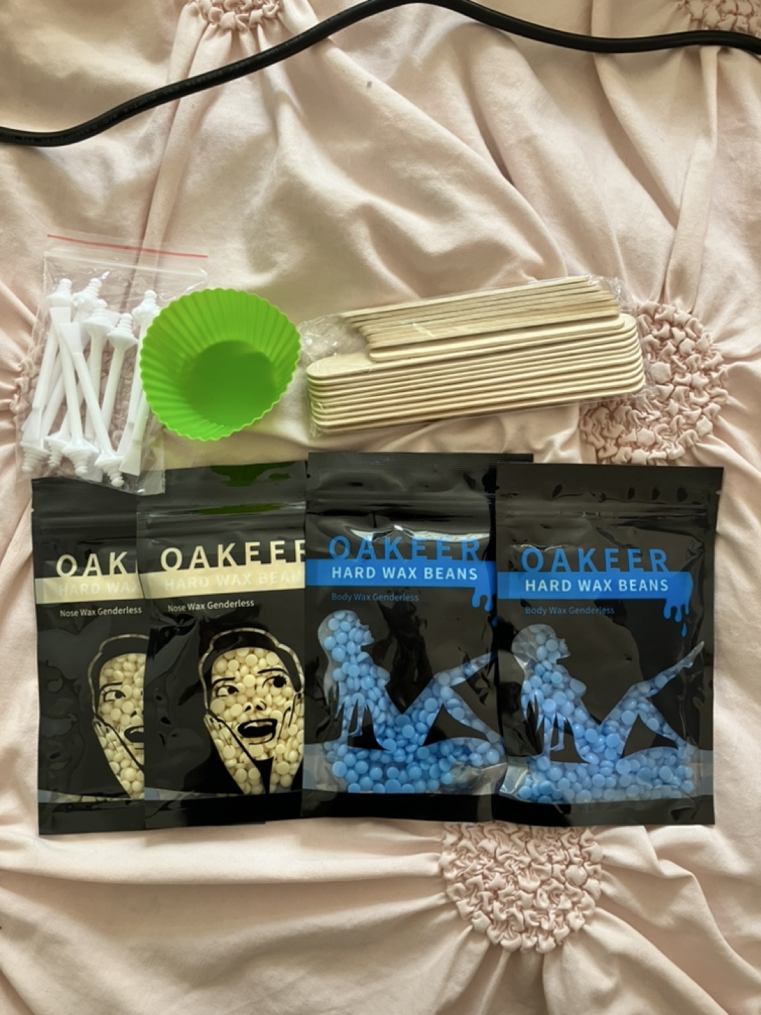 Wax warmer, pink silicone inner pot, wooden applicators, and three bags of Oakeer hard wax beans. Includes nose wax applicators and a silicone cupcake mould. Great for at-home waxing.