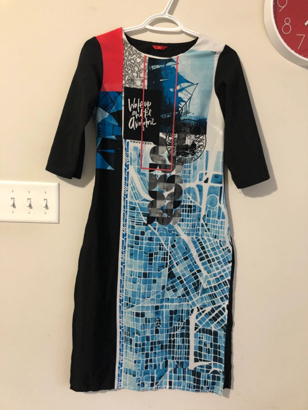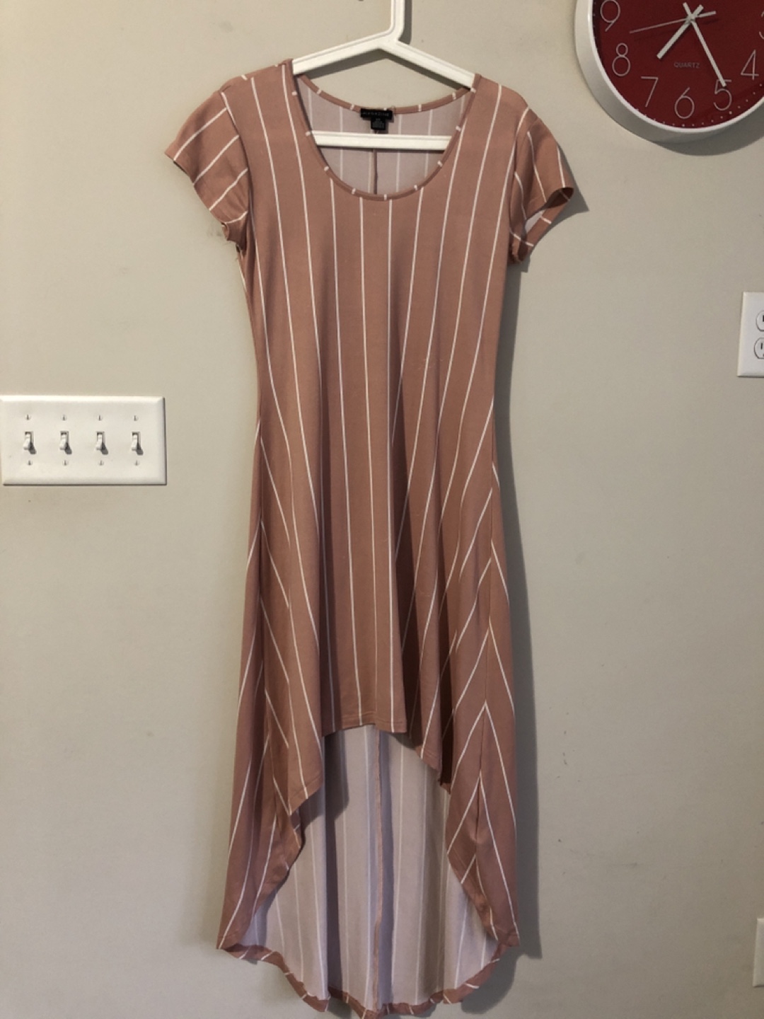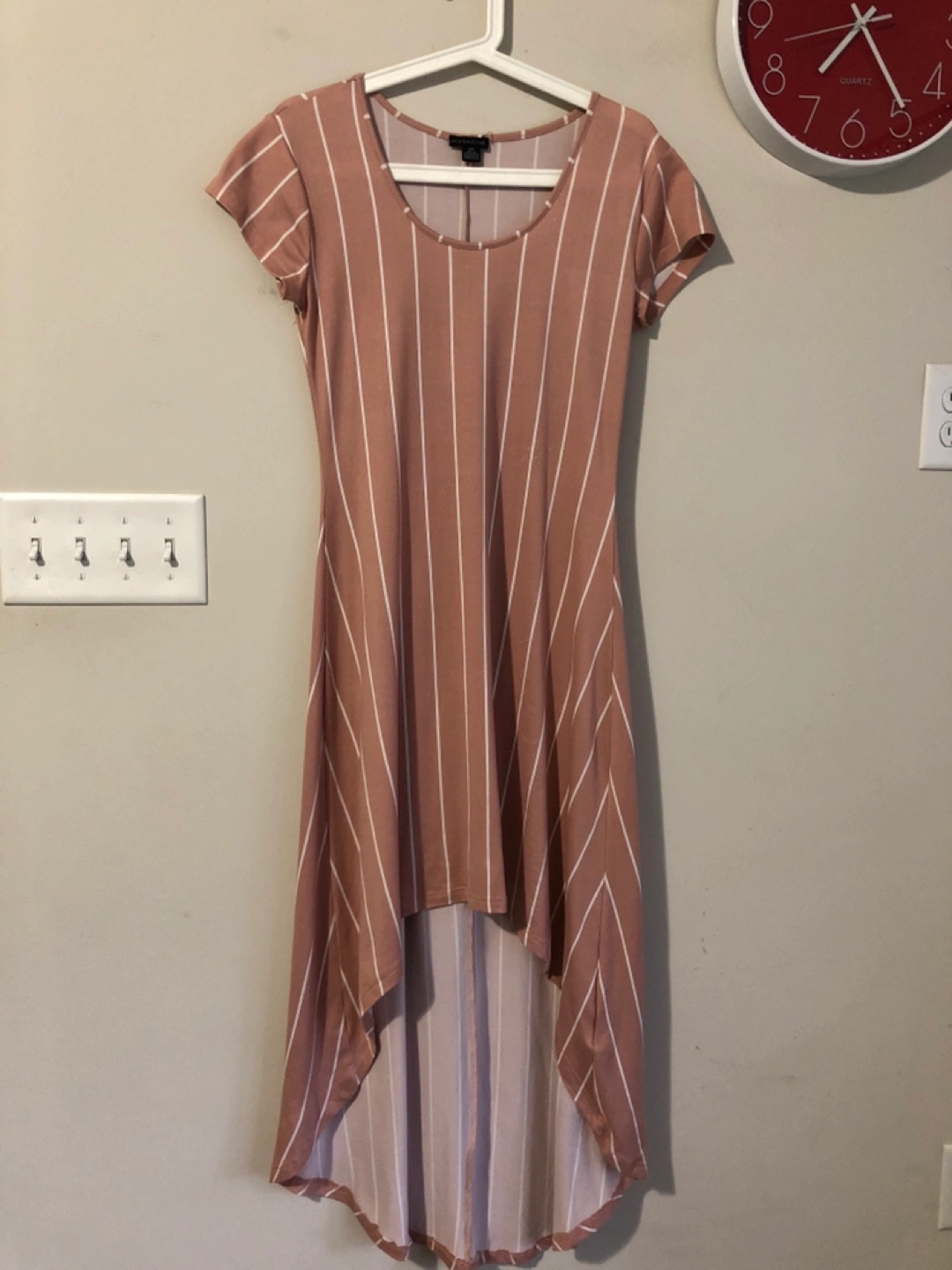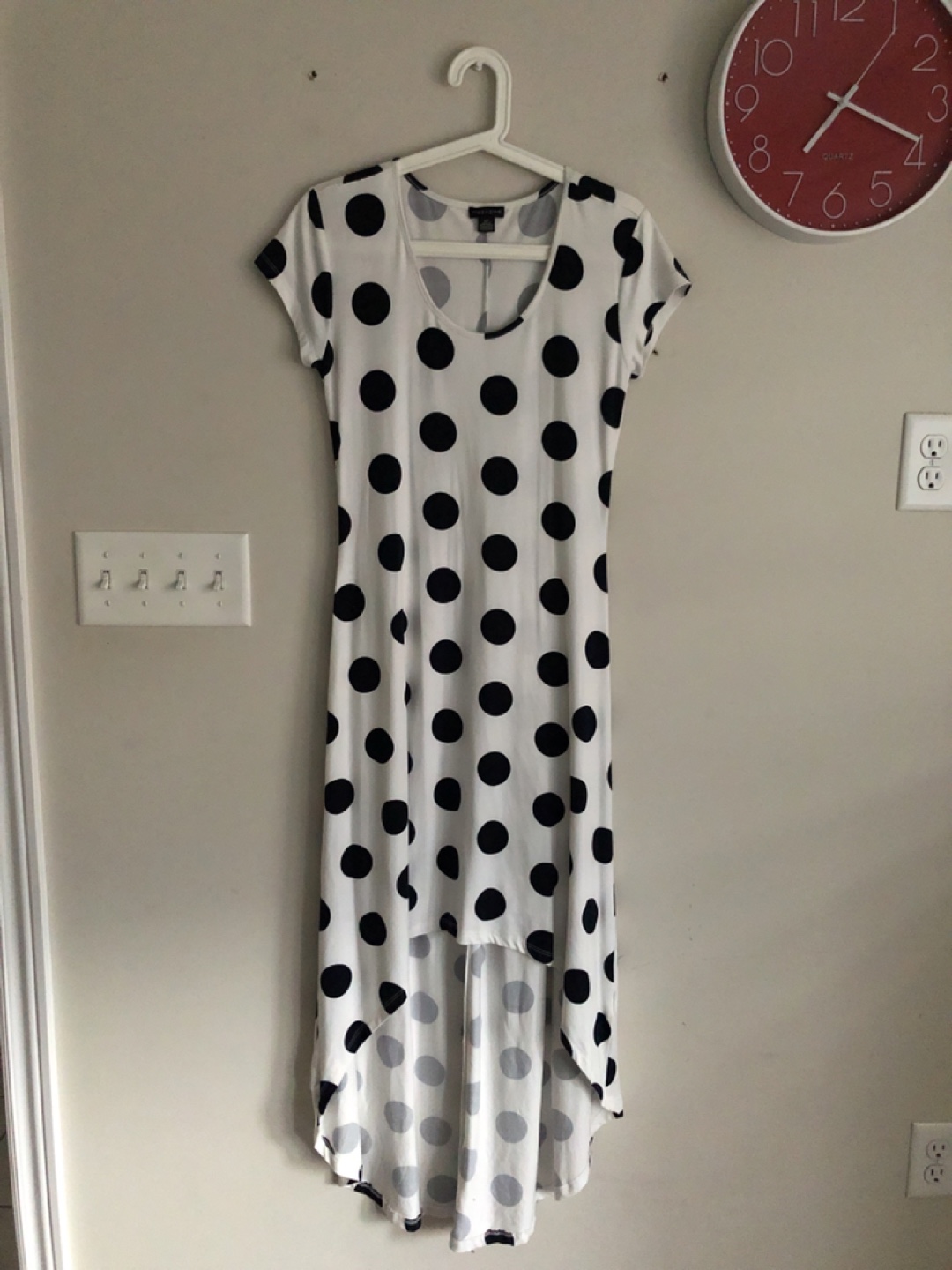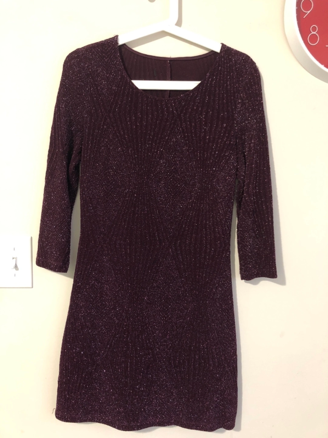Four women's dresses in a bundle. One sparkly burgundy dress with three-quarter sleeves. One black and white graphic print dress with three-quarter sleeves. One high-low polka dot dress with short sleeves. One high-low striped dress with short sleeves. Sizes vary.