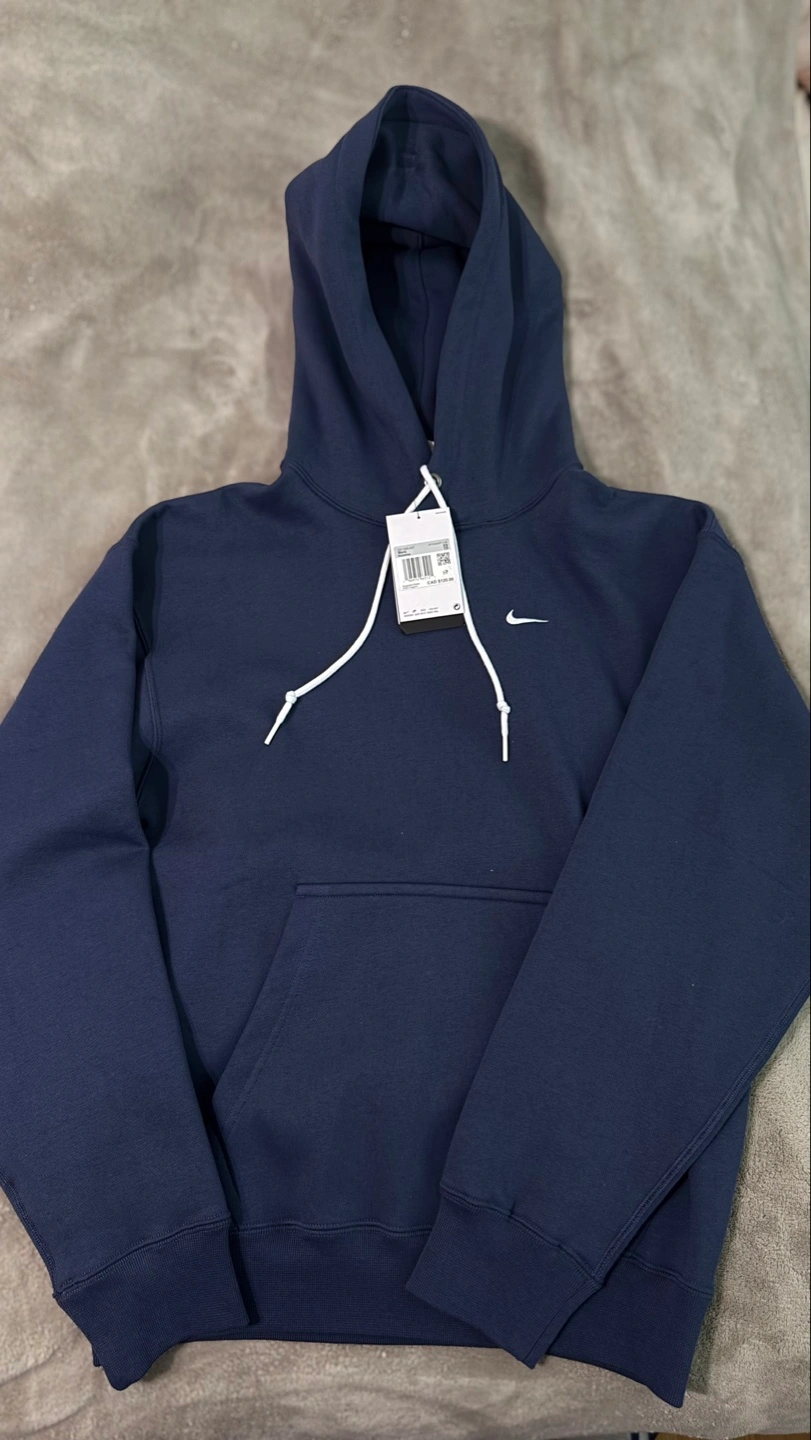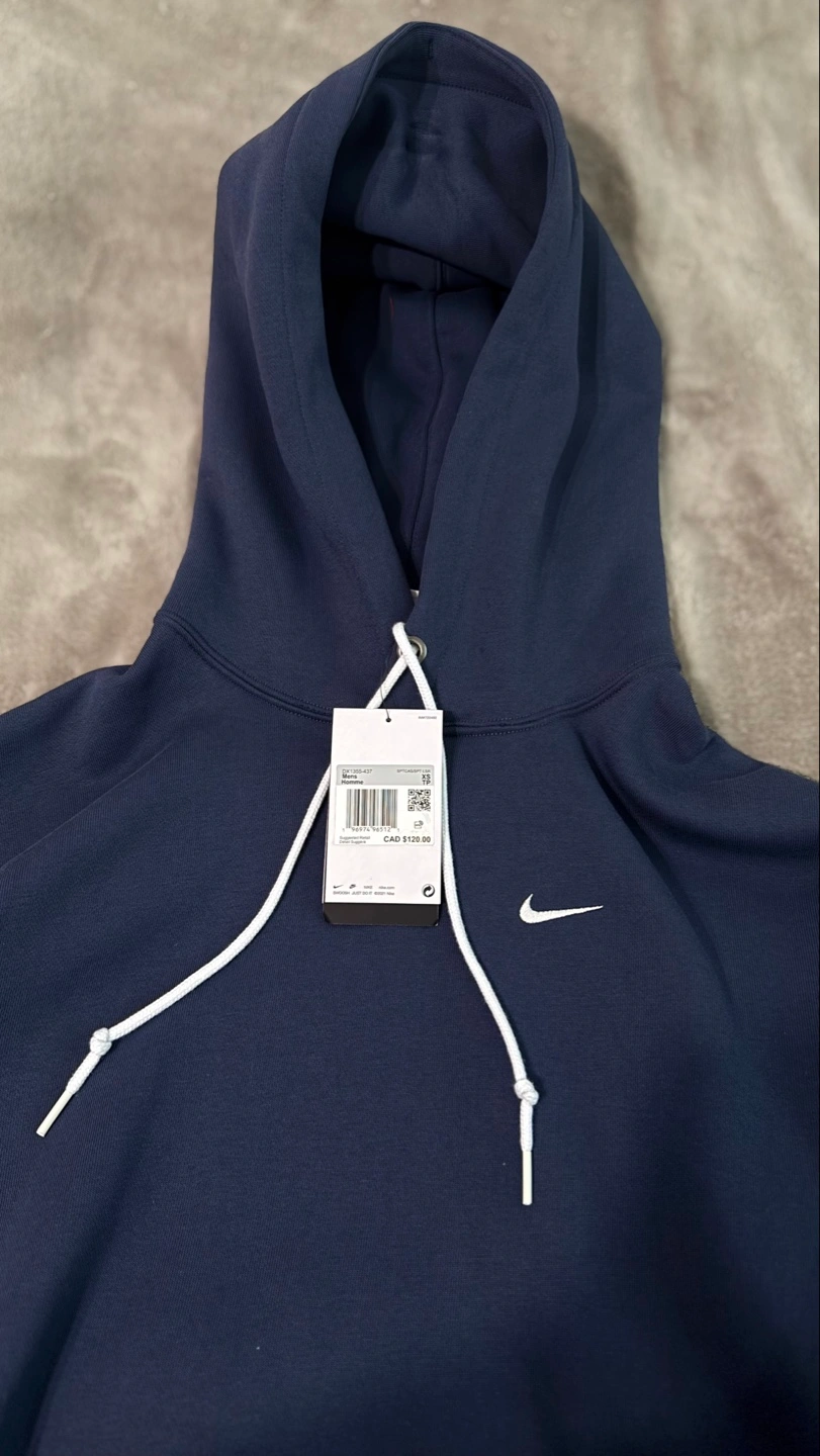 Navy blue hoodie. Features a kangaroo pocket and drawstring hood. Small Nike logo on the chest. New with tags.