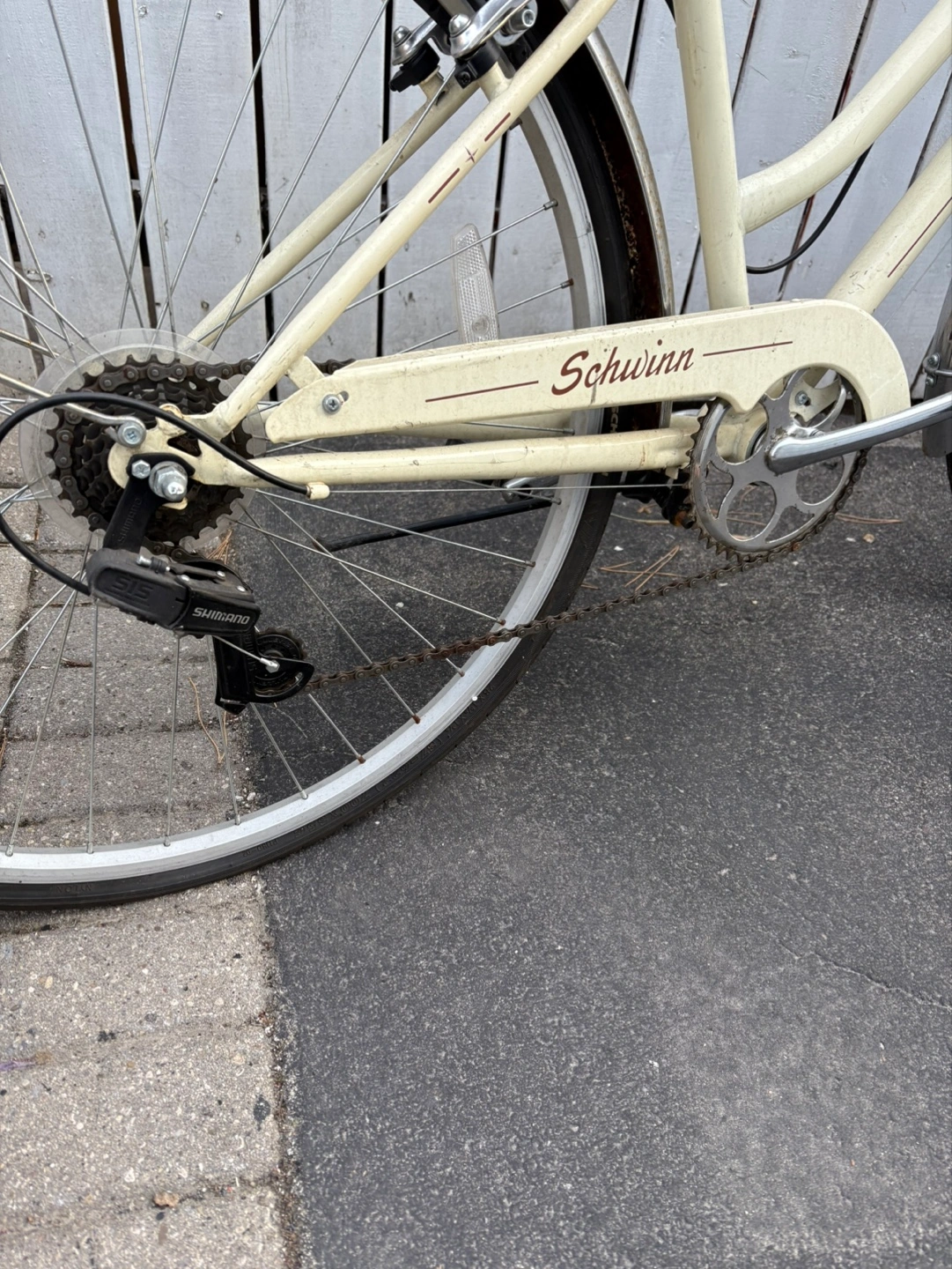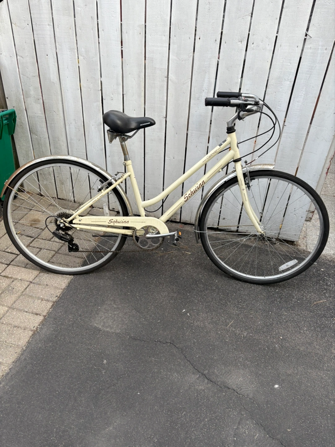 Cream coloured women's bicycle.