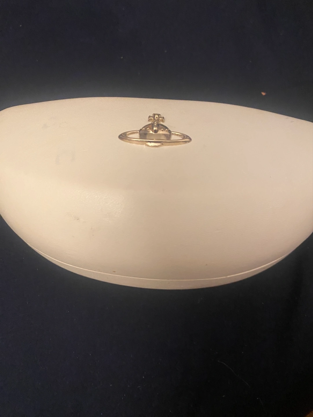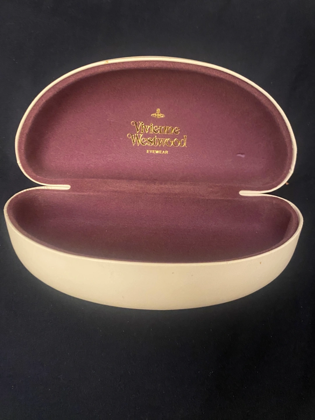 Hard shell eyeglasses case. Off-white exterior, burgundy interior. Classic Vivienne Westwood orb logo. Excellent for storing and protecting your eyewear.