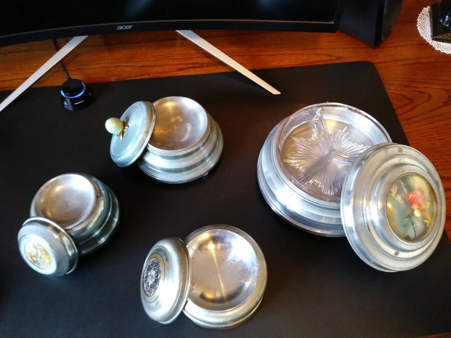 A collection of four decorative music boxes, likely made of metal. Each box features a unique lid design, with one showing a pastoral landscape and another a floral motif. They appear to be wind-up music boxes. These decorative pieces would be a lovely addition to a shelf or dresser. All are vintage grade in amazing clean condition all with individual music pieces $40.00 to $60.00 each
