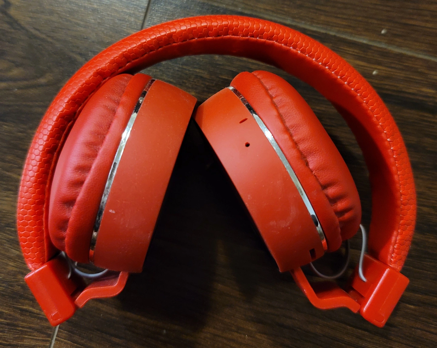 Red headphones with FM radio and MP3 player. The headphones have a black trim around the outside of the ear cups. There is a silver trim around the edge of the ear cups as well. The headphones are marked with "Headphones FM stereo radio Mp3 player SH10".