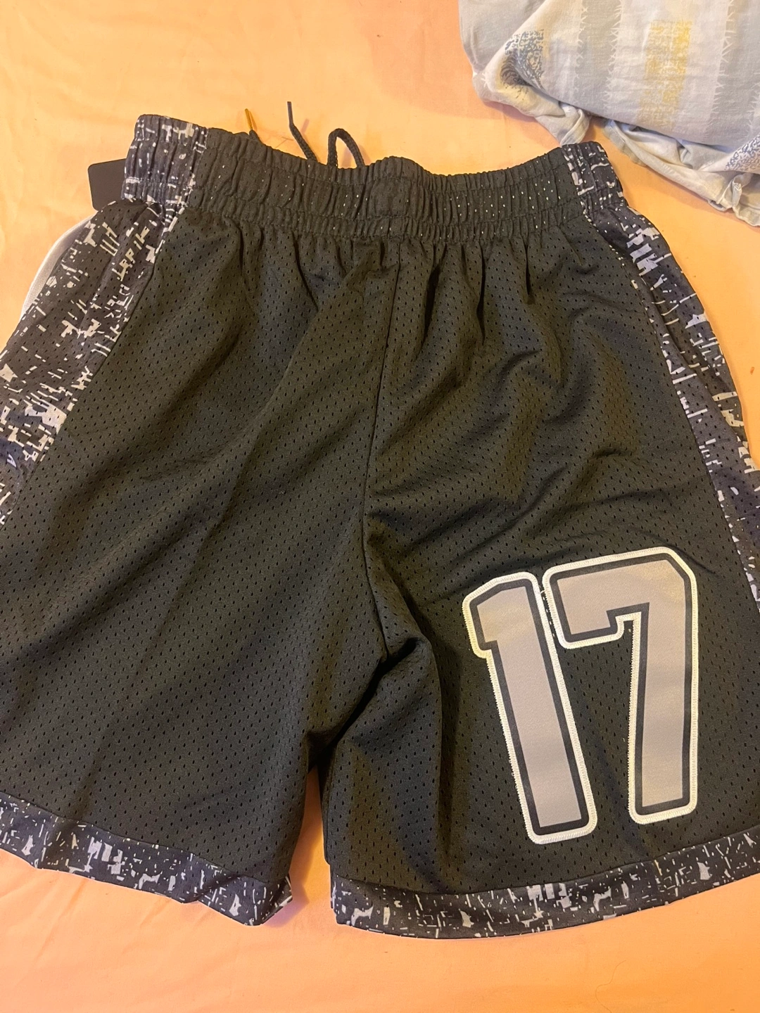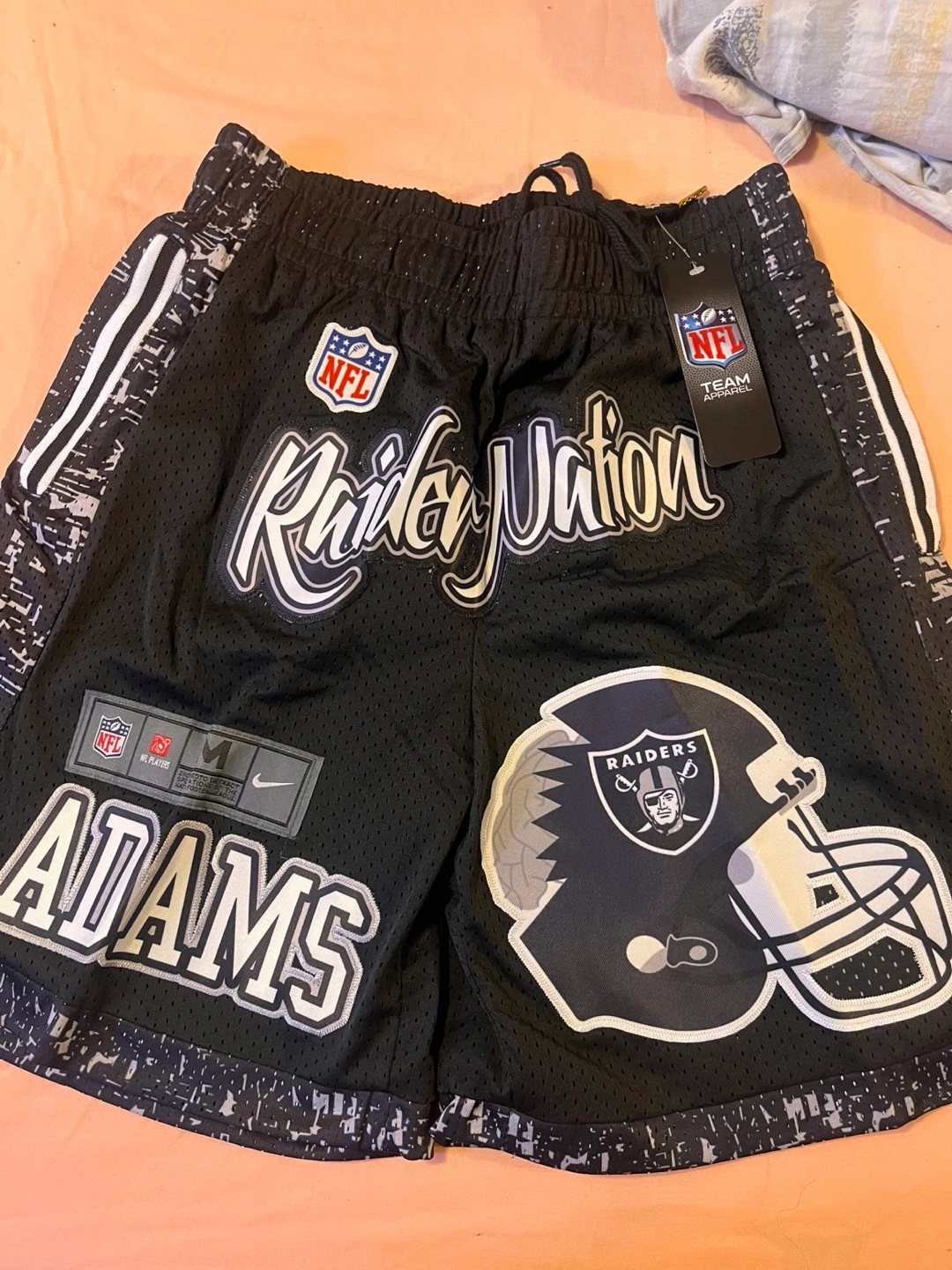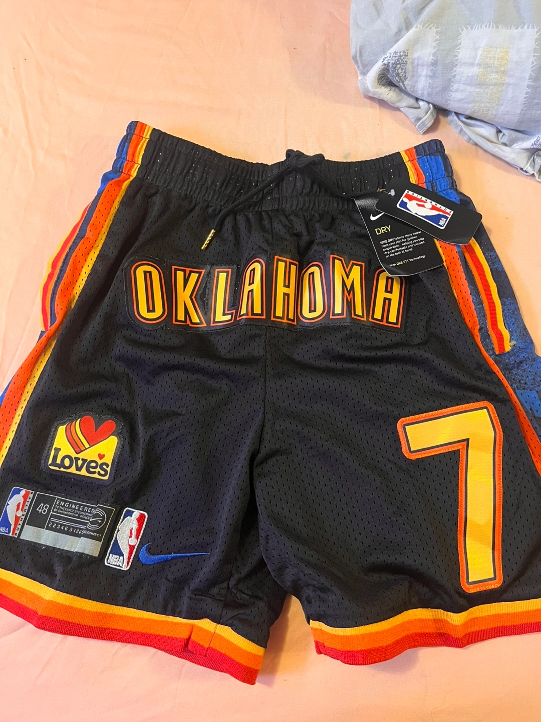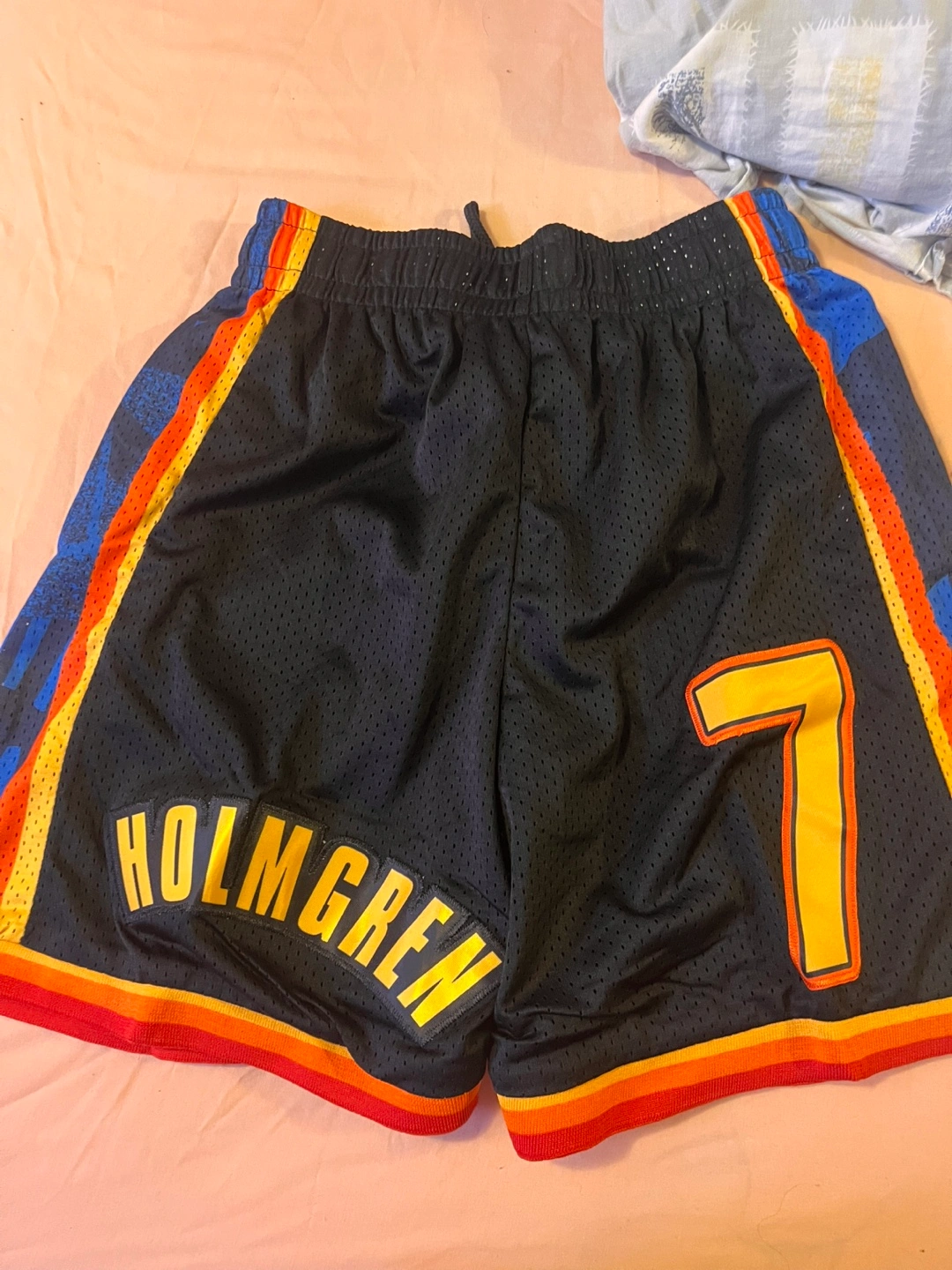 Two pairs of basketball shorts. One pair features the Oklahoma City Thunder colours and the number 7, with Holmgren on the back. The other pair is red with the number 23 and features Michael Jordan's name and All-Star branding. Both are new with tags 40 each