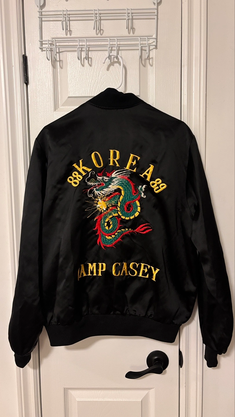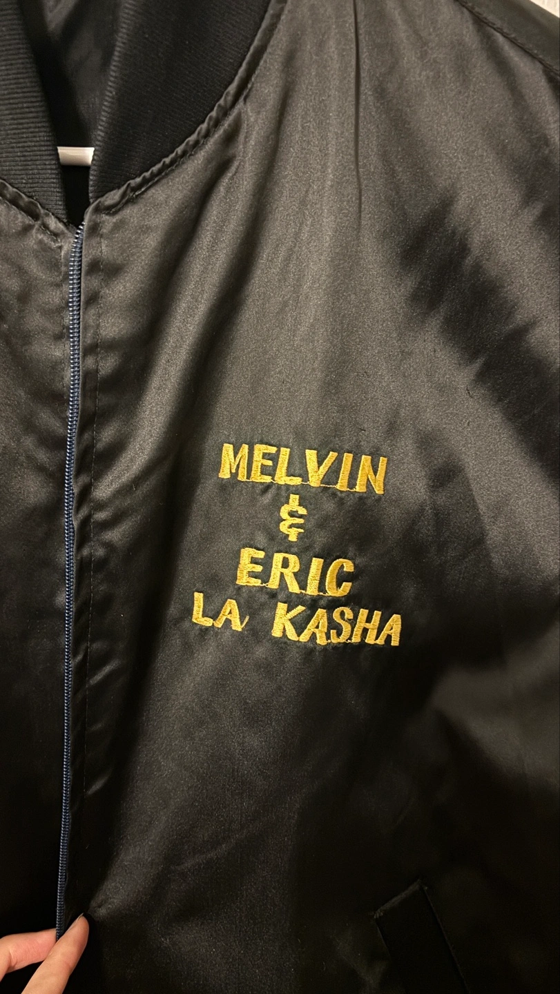 Unique vintage Korea Camp Casey satin bomber jacket. Features embroidered dragon on the back, text is also embroidered. Front features 'Melvin & Eric La Kasha' embroidery. Condition is like new (took a good care of it), suitable for spring, summer and warm autumn.