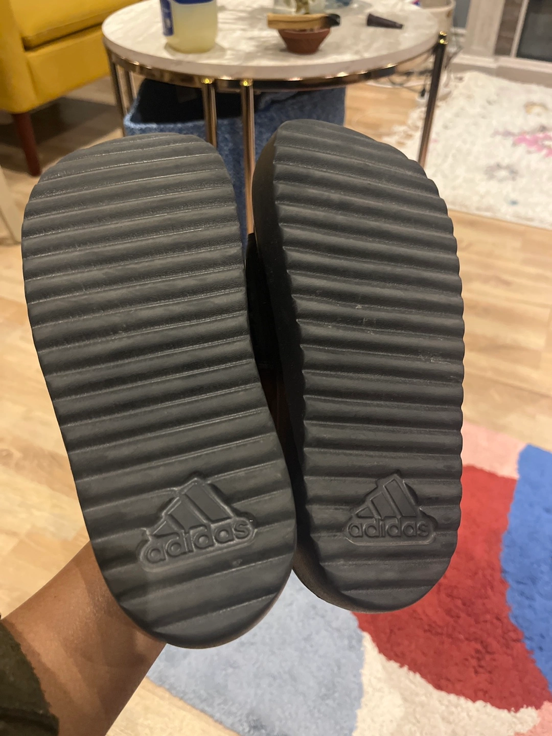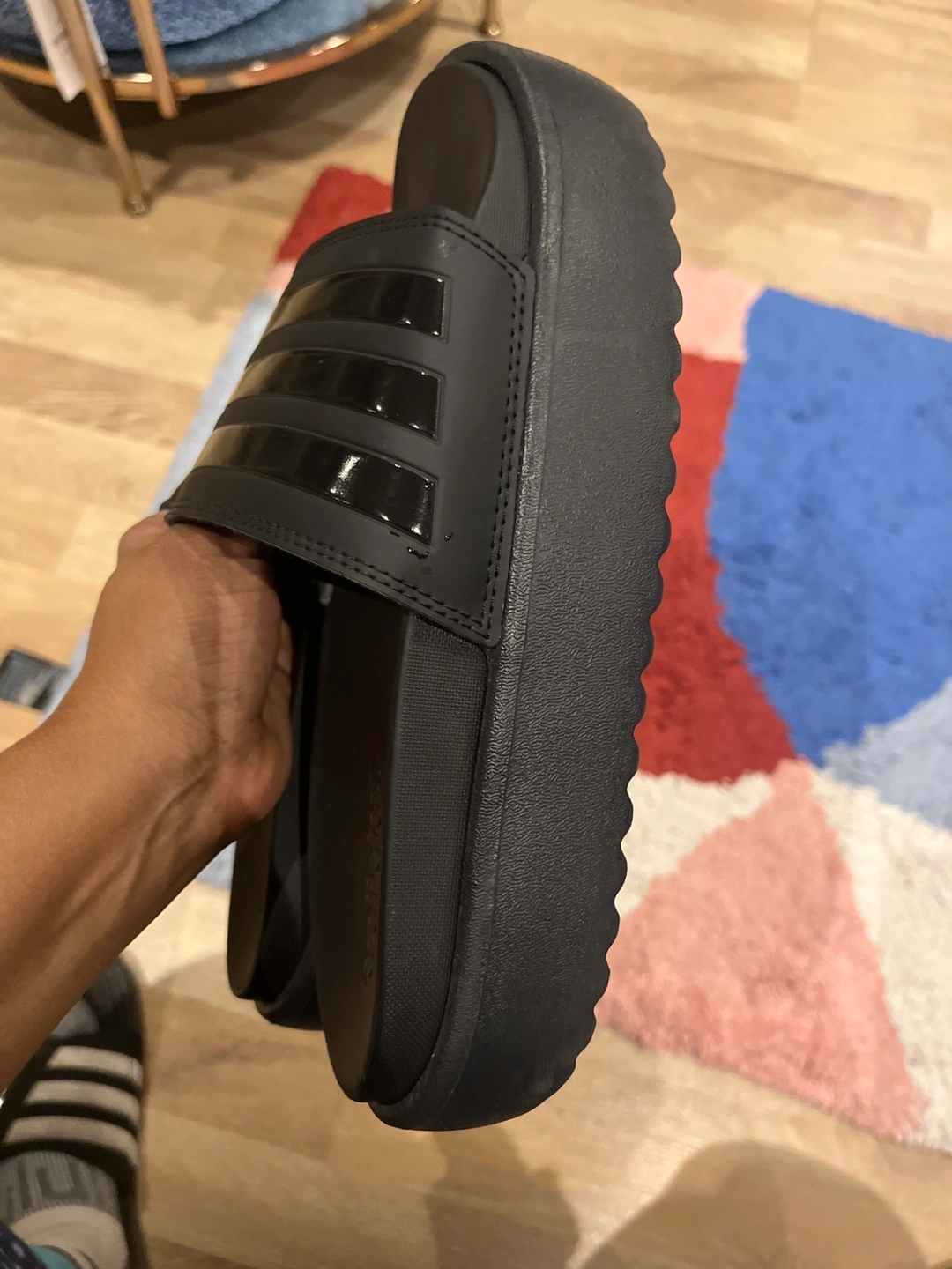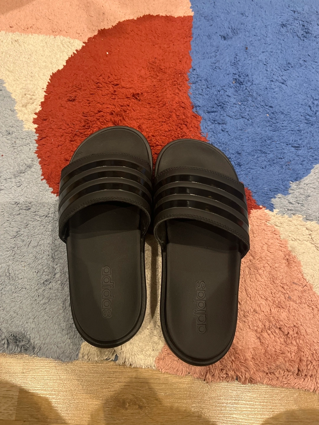 Pair of black Adidas slides. Platform style. Good for summer. Comfortable. New slides have the bill. Not comfortable with platform sandals so selling