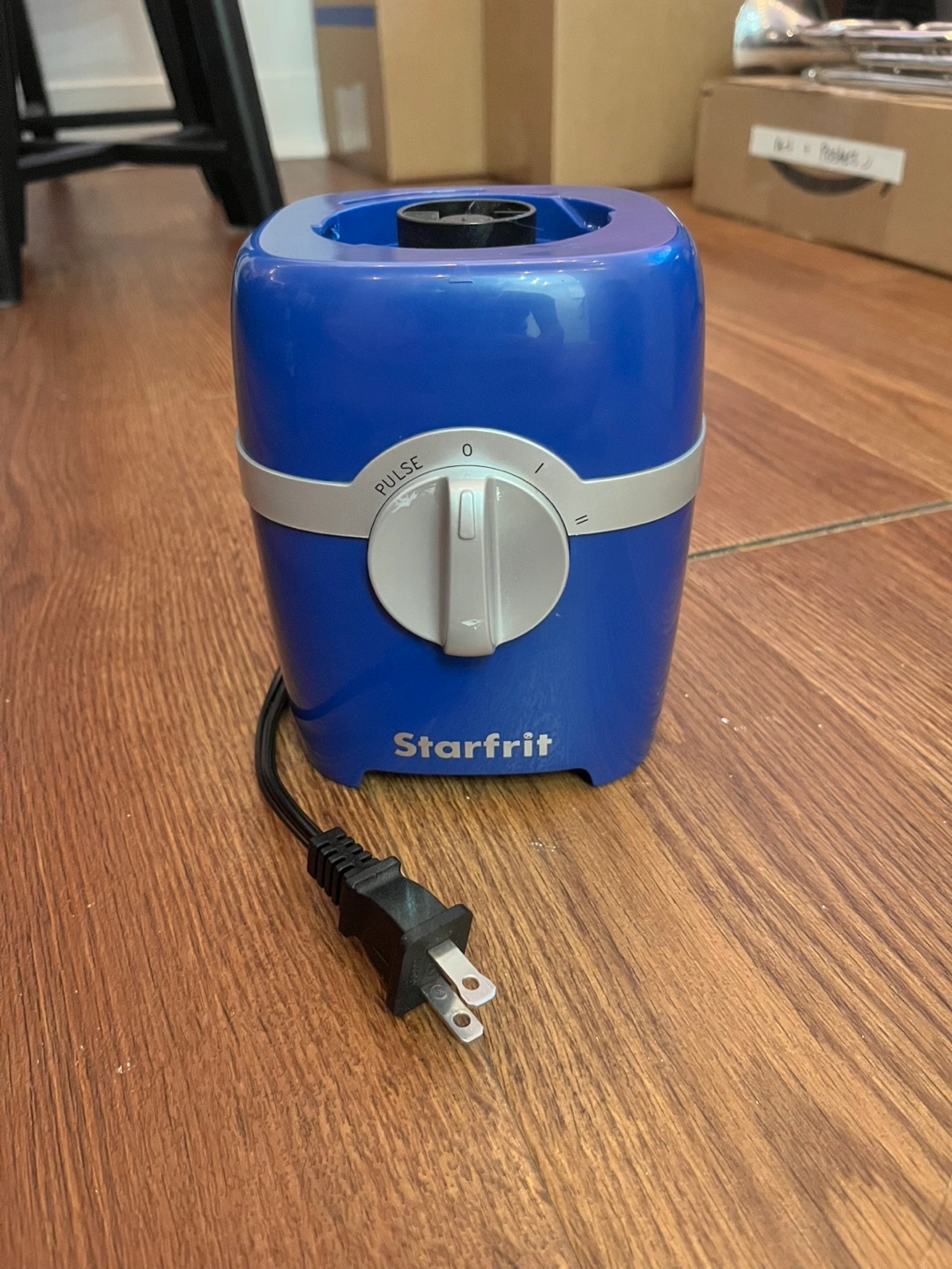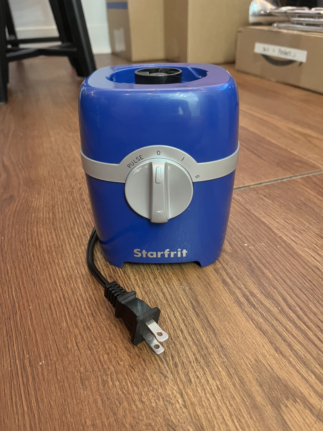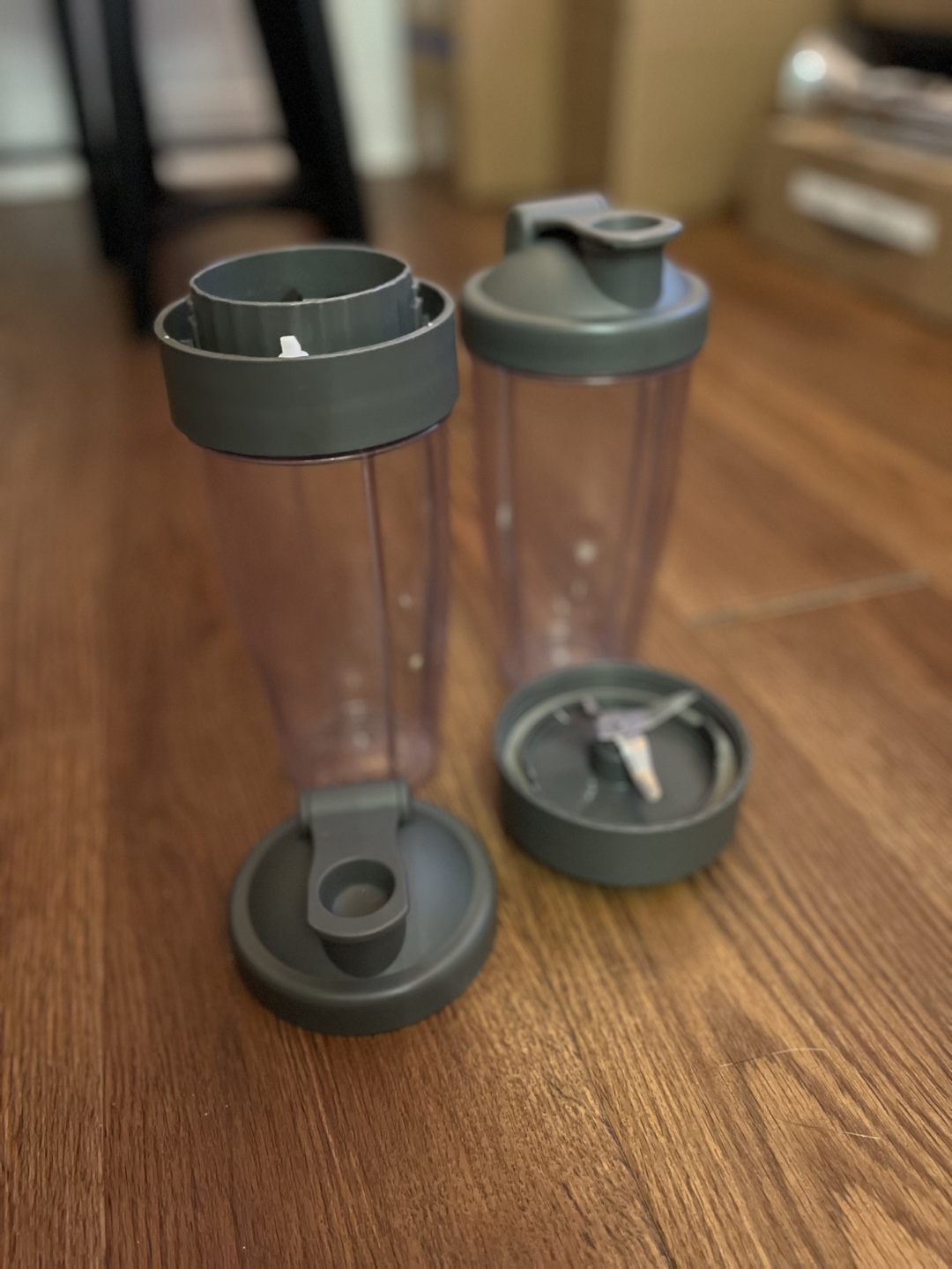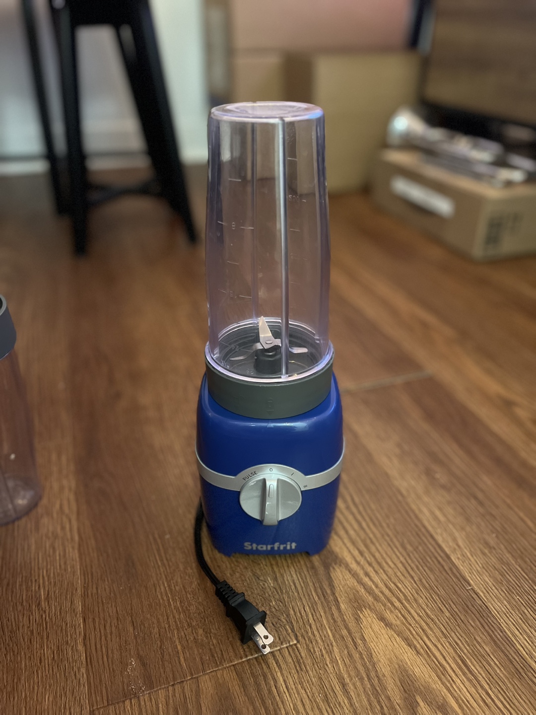 Compact personal blender. Includes two attachments, and travel lids for drinking on the go.