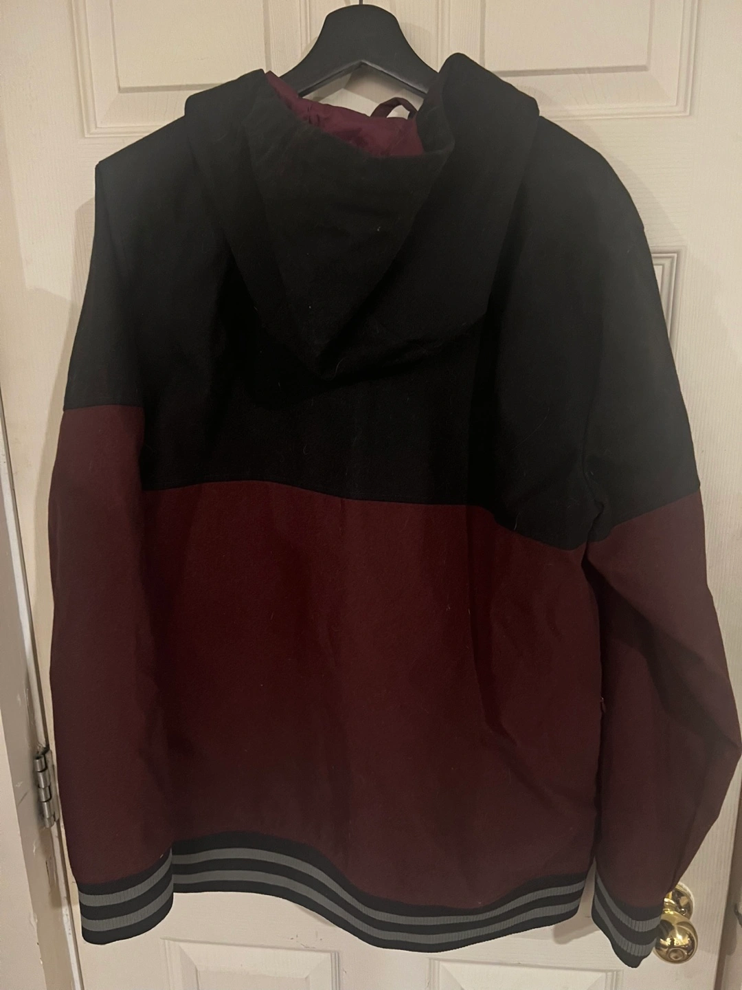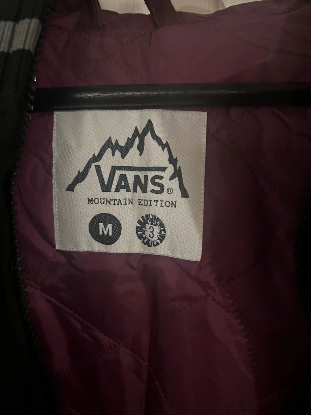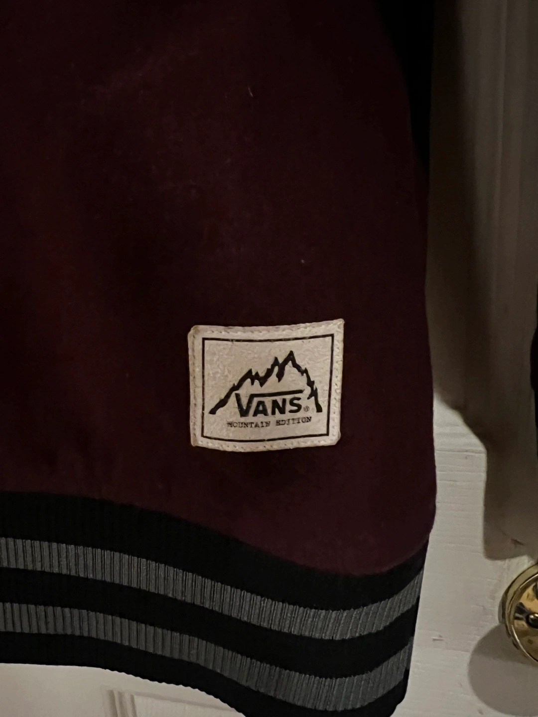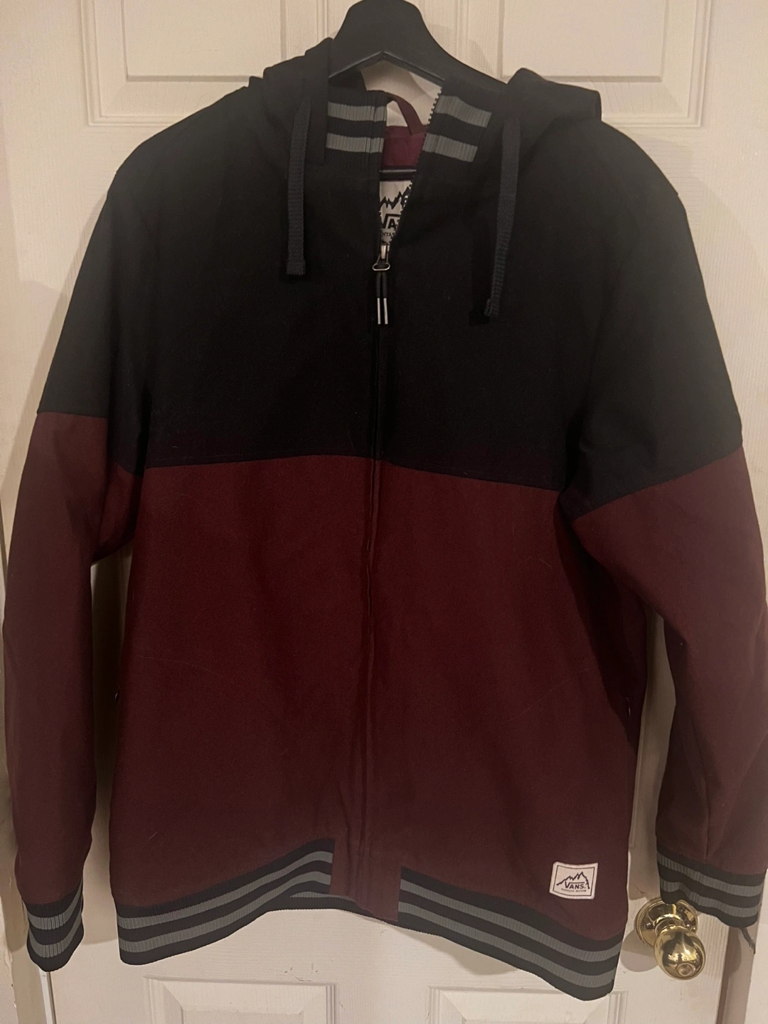 Men's size medium Vans Mountain Edition zip-up hoodie. Burgundy and black colour block design. Features grey and black striped cuffs and hem. Warm, comfortable jacket, perfect for cooler weather.