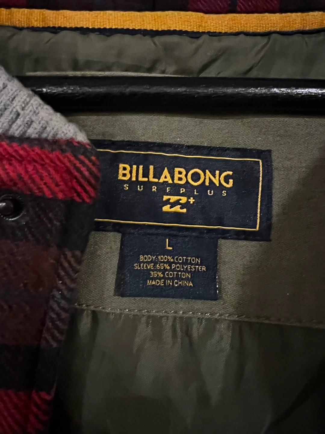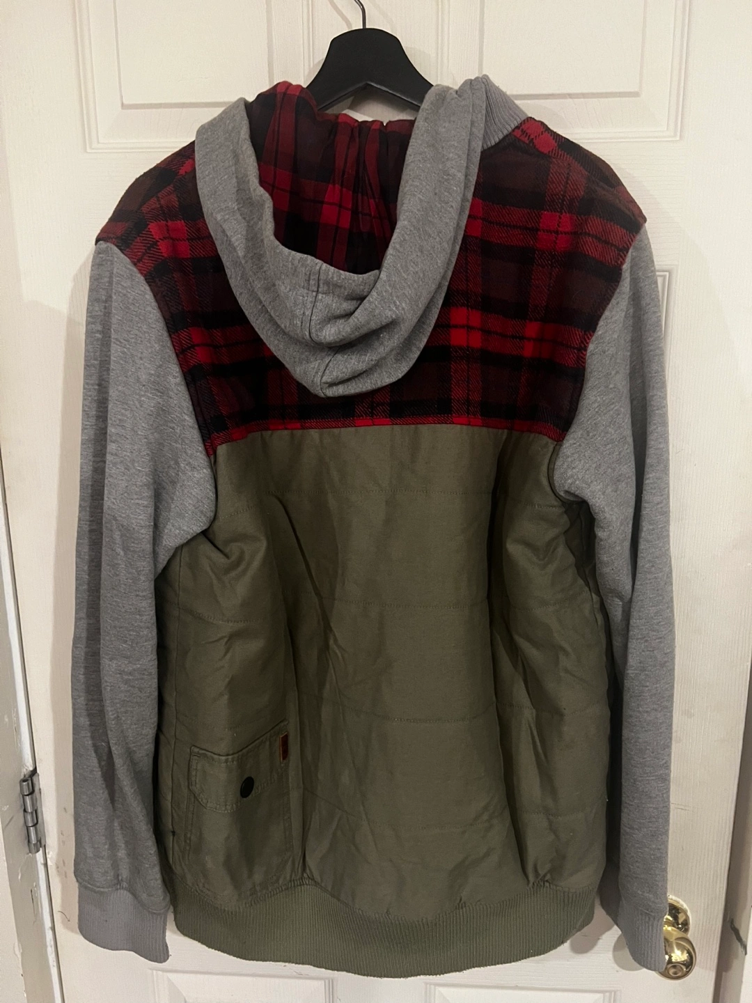 Men's size large Billabong Surf Plus jacket. Olive green and red plaid. Hooded. Button front. Grey sleeves. Two front pockets.
