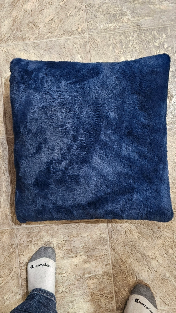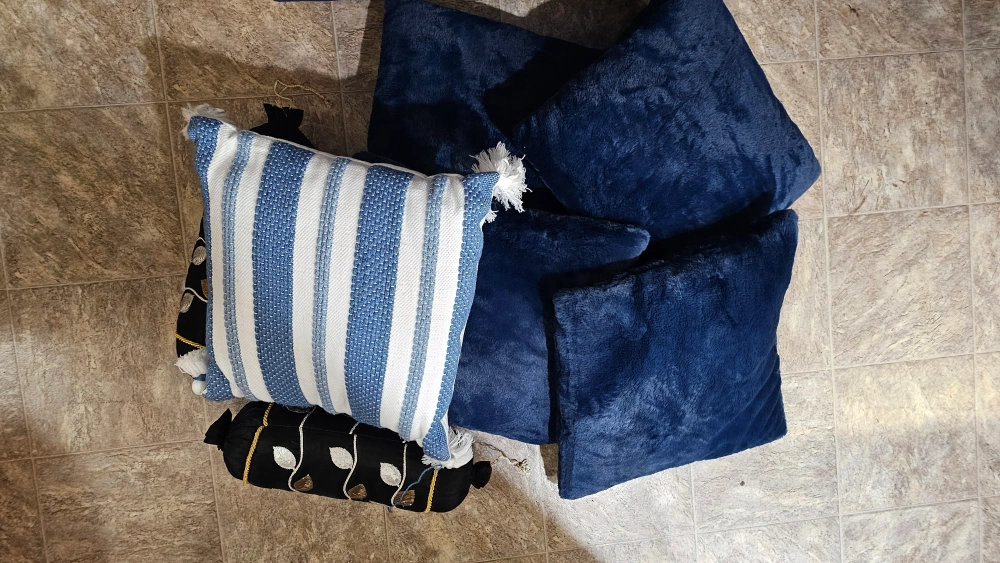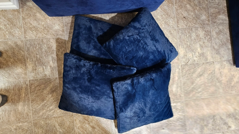 Set of five blue plush pillows. Four square pillows, one larger rectangular pillow. Soft and cozy, perfect for adding comfort and style to your living space. Also includes one striped and one cylindrical pillow.