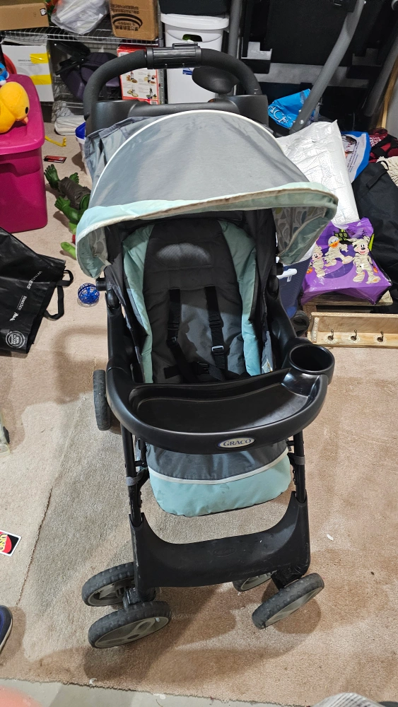 Lightly used Graco stroller and car seat. Compact foldable design. Features a cup holder and tray. Great for travel. Suitable for newborns to toddlers.