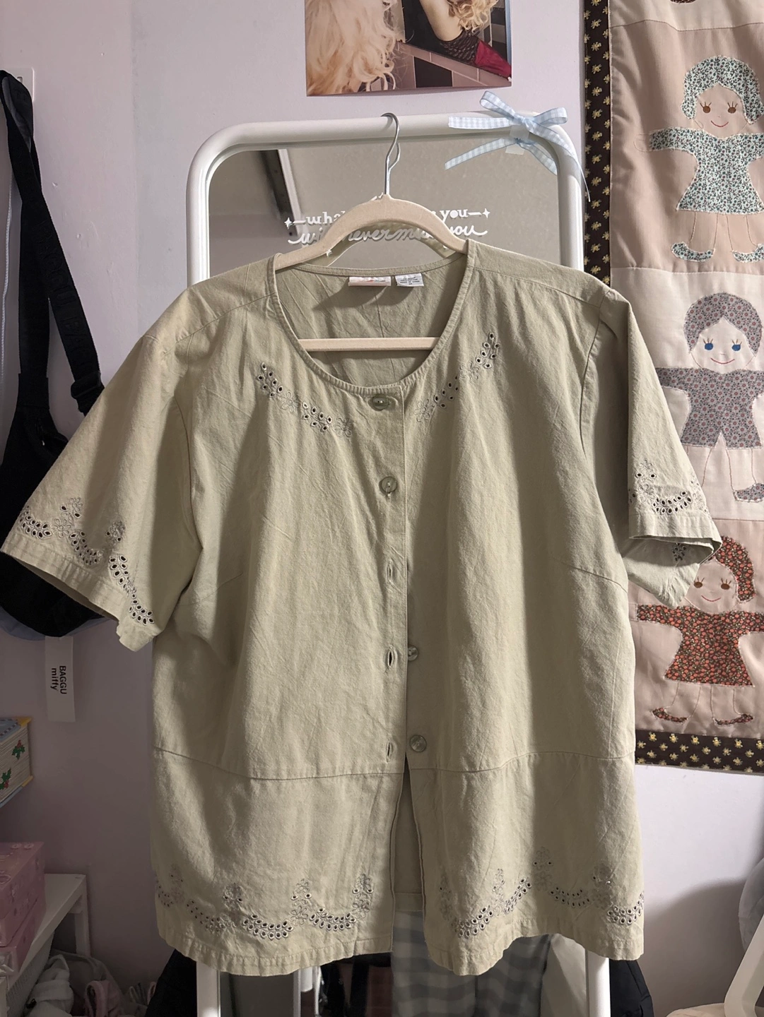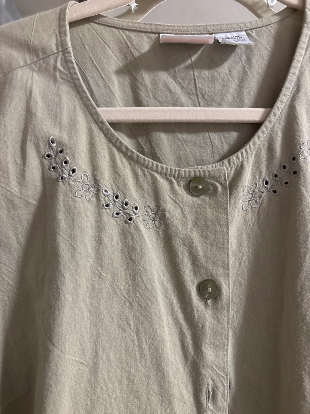 Sage green short sleeve button up blouse. Features embroidered floral accents. Relaxed fit. Size M