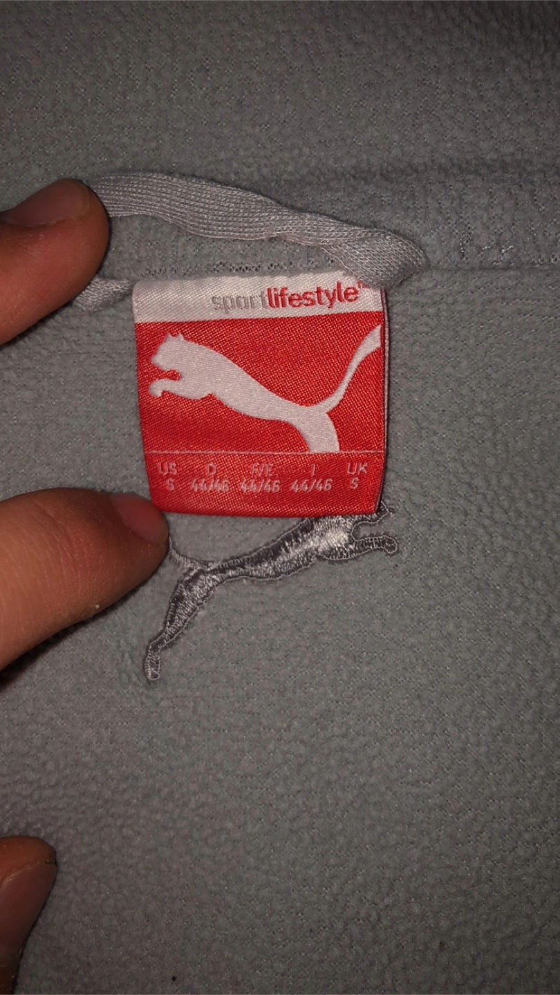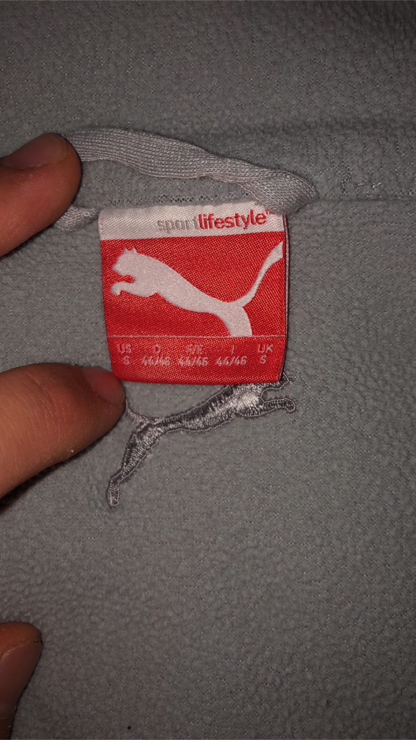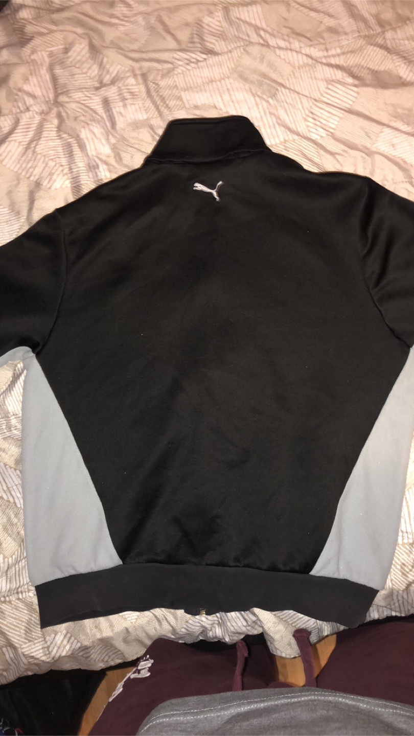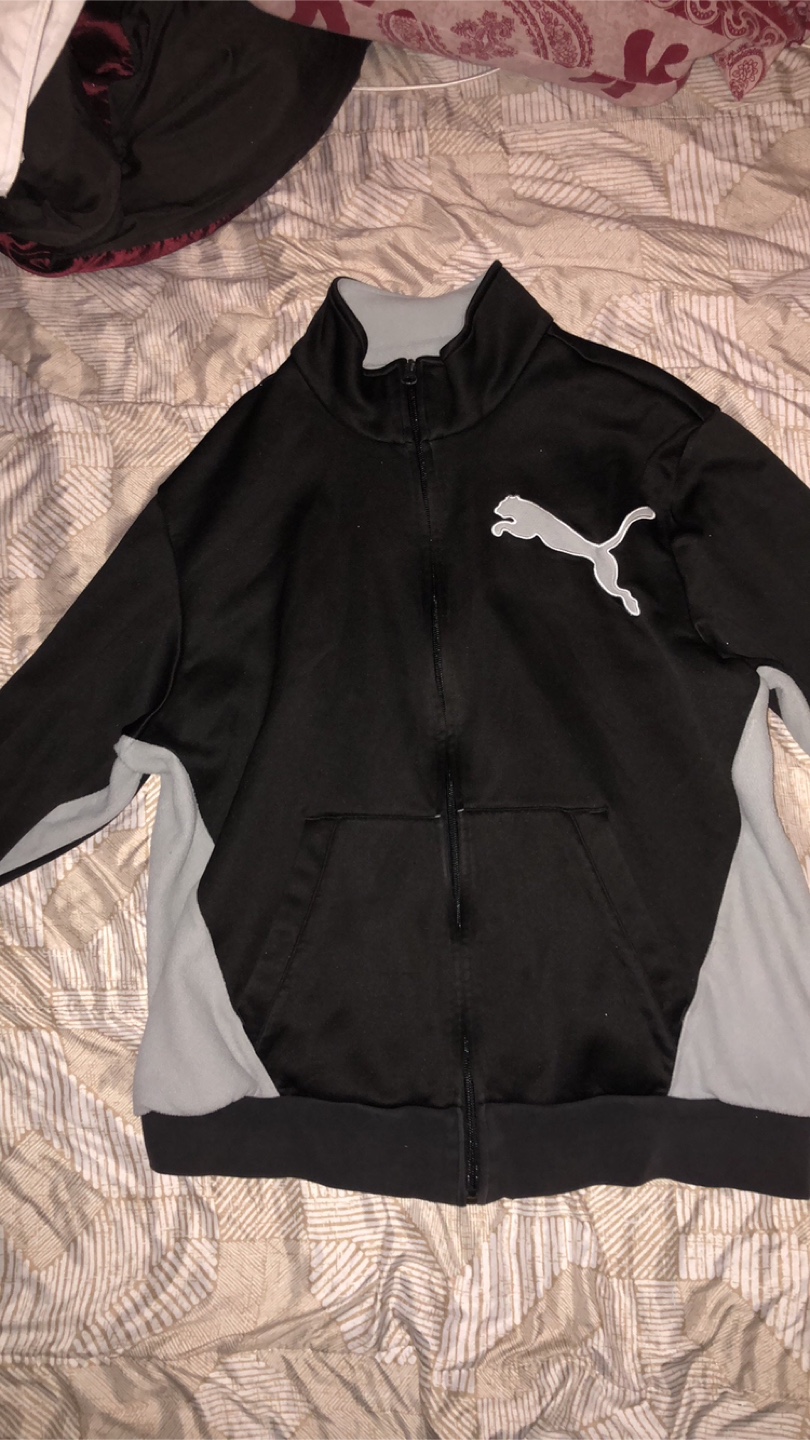 Men's black and grey Puma track jacket. Full zip closure. Features Puma logo. Size small.