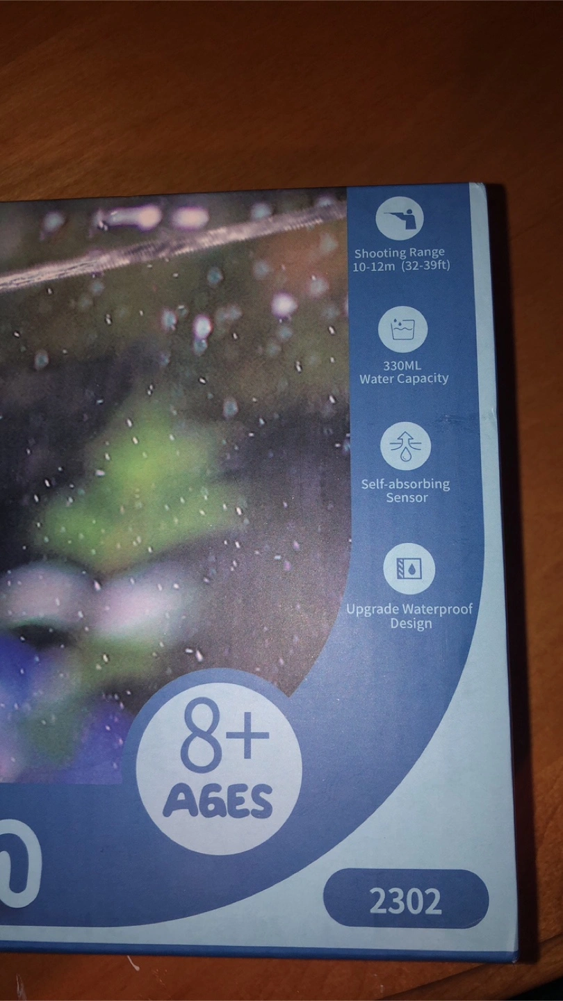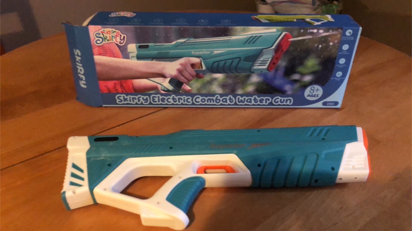 Electric water gun. Teal and white. Includes USB charging cable. For ages 8+. Shows some minor wear.