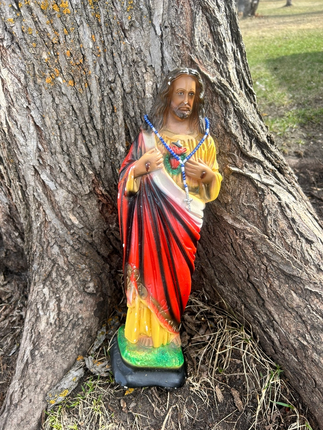 Religious statue. Shows Jesus with Sacred Heart. Features blue rosary beads. Painted red and yellow robe. Small size. Collectible.