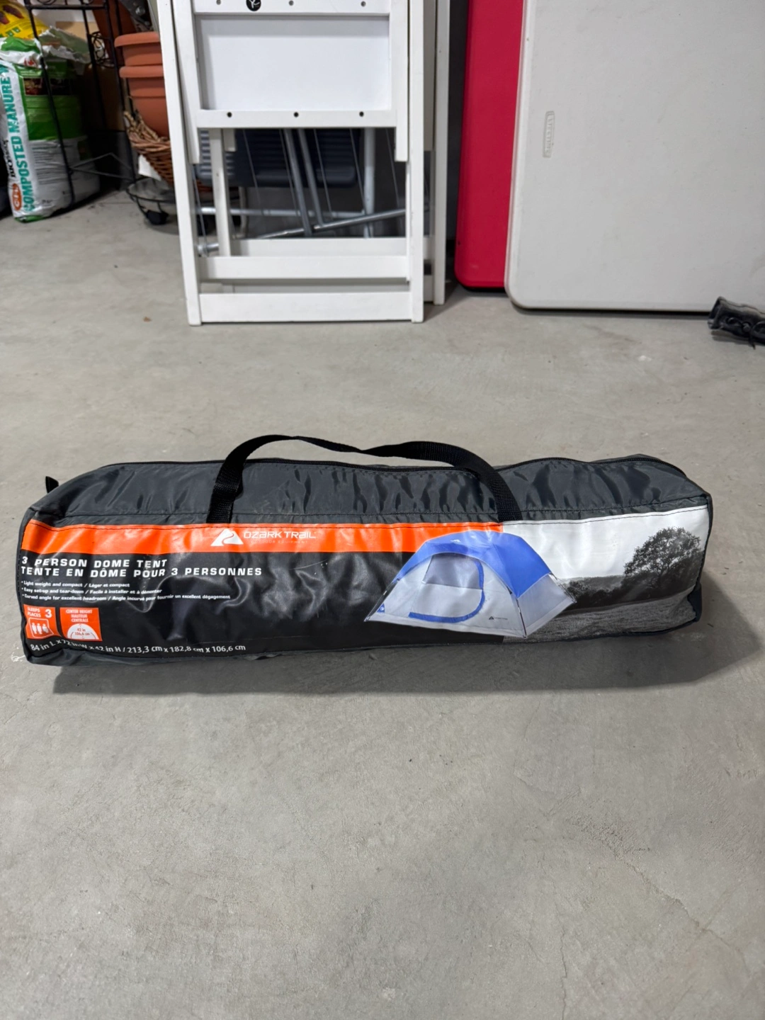 Lightweight and compact 3-person dome tent. Easy setup. Excellent headroom. 84 inches L x 72 inches W x 12 inches H.