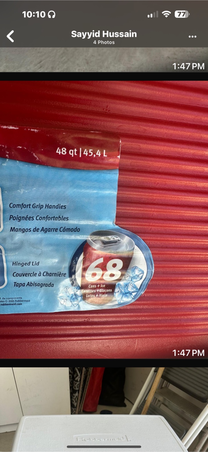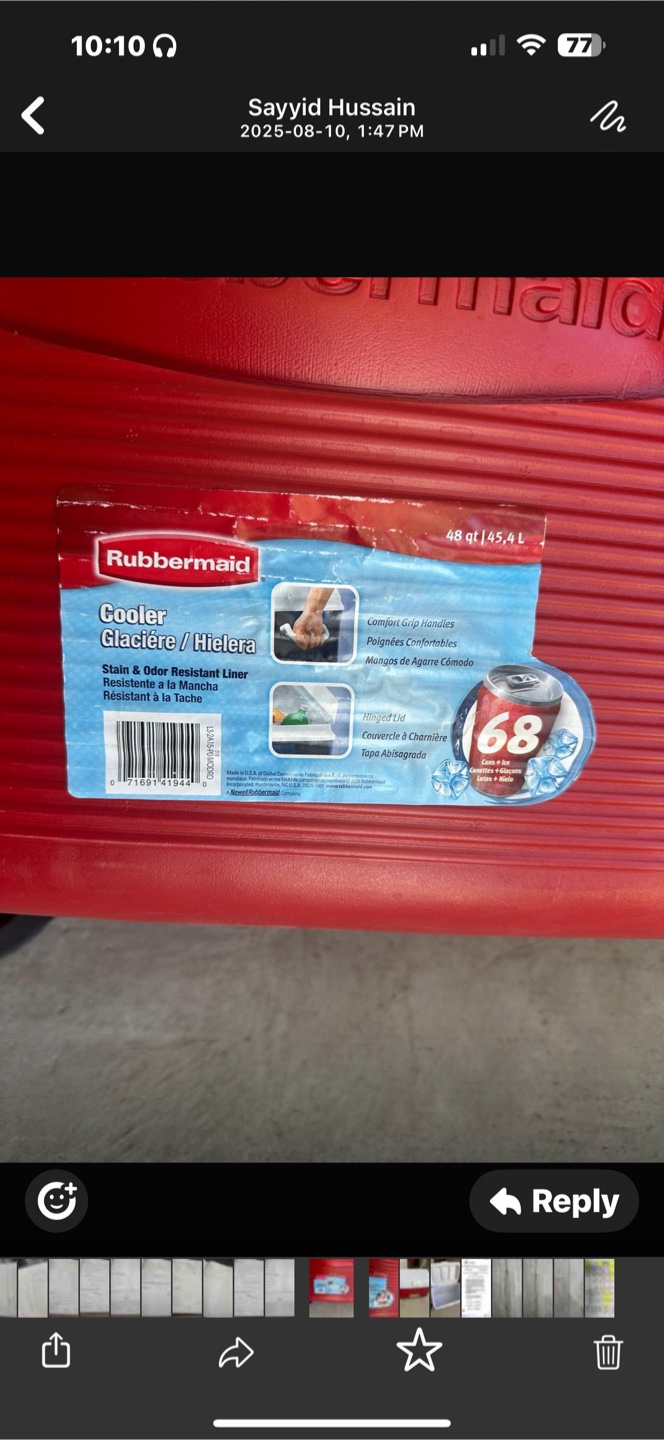 Buy & SellRubbermaid CoolerRubbermaid Cooler$15Large capacity cooler. Red and white. Great for picnics or camping. Durable plastic construction. Features a handle for easy portability.WHERE TO MEETCheck LocationView MapSELLERFarzanaRanchlands442 reviews3 chats·7 favorites·117 viewsSEND CHAT TO SELLERHi Farzana! I’m interested in your listing.Hi Farzana! I’m interested in your listing.Get the Karrot app to chatSign In to chat