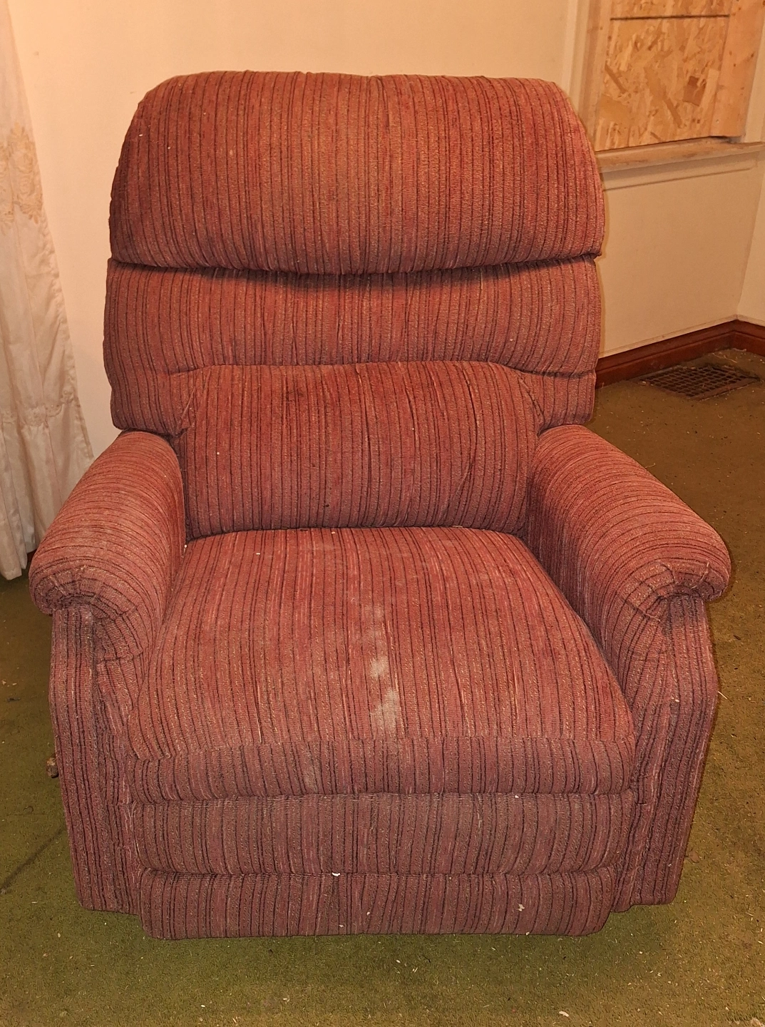 Reclining armchair. Maroon striped fabric. Shows wear. Needs cleaning.