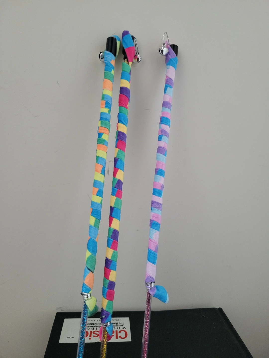 Three colourful cat wands. Fabric covered wands with bells. Great for interactive play.