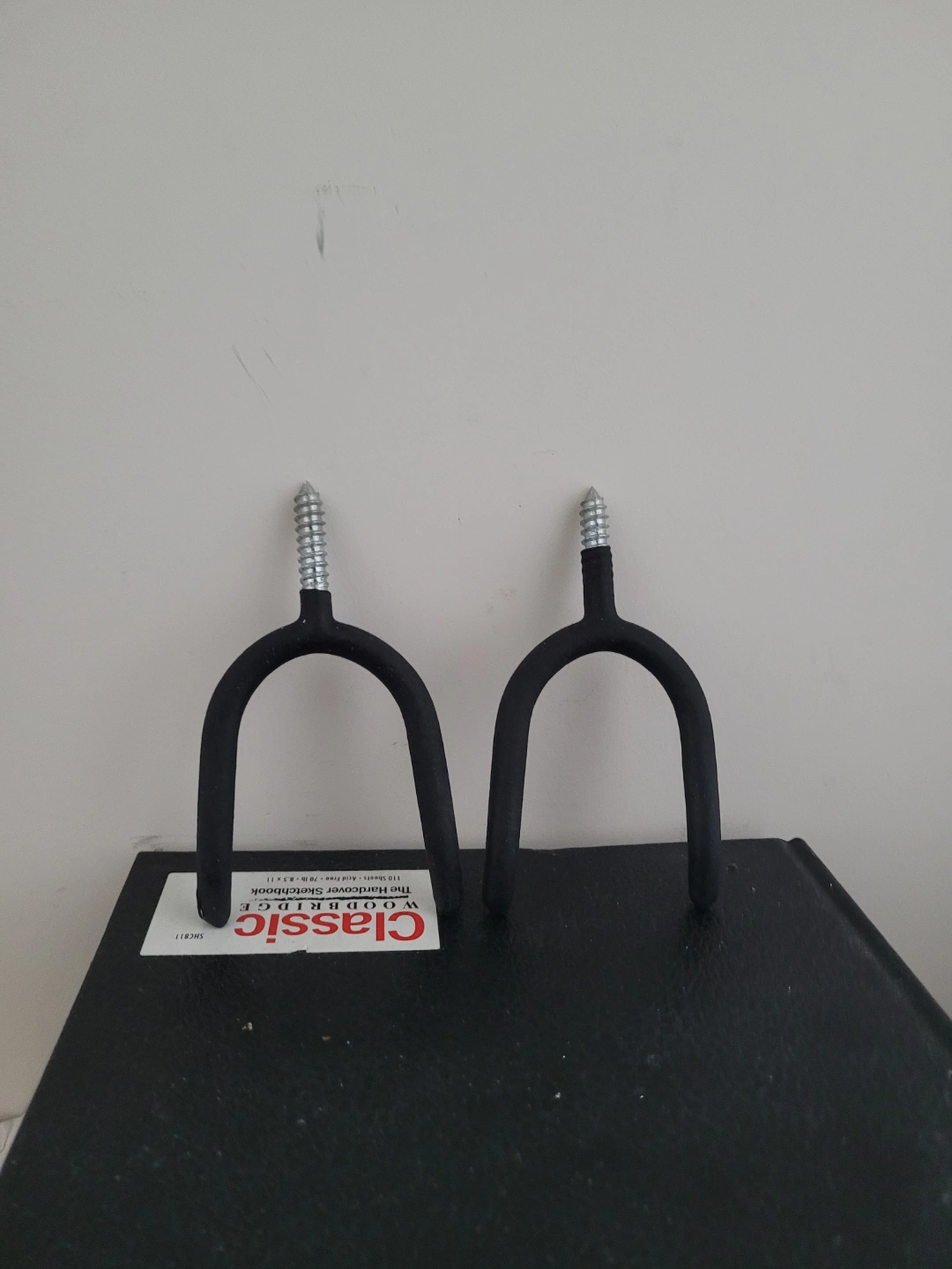 Two black metal wall hooks. Screws included. Classic Woodbridge brand.