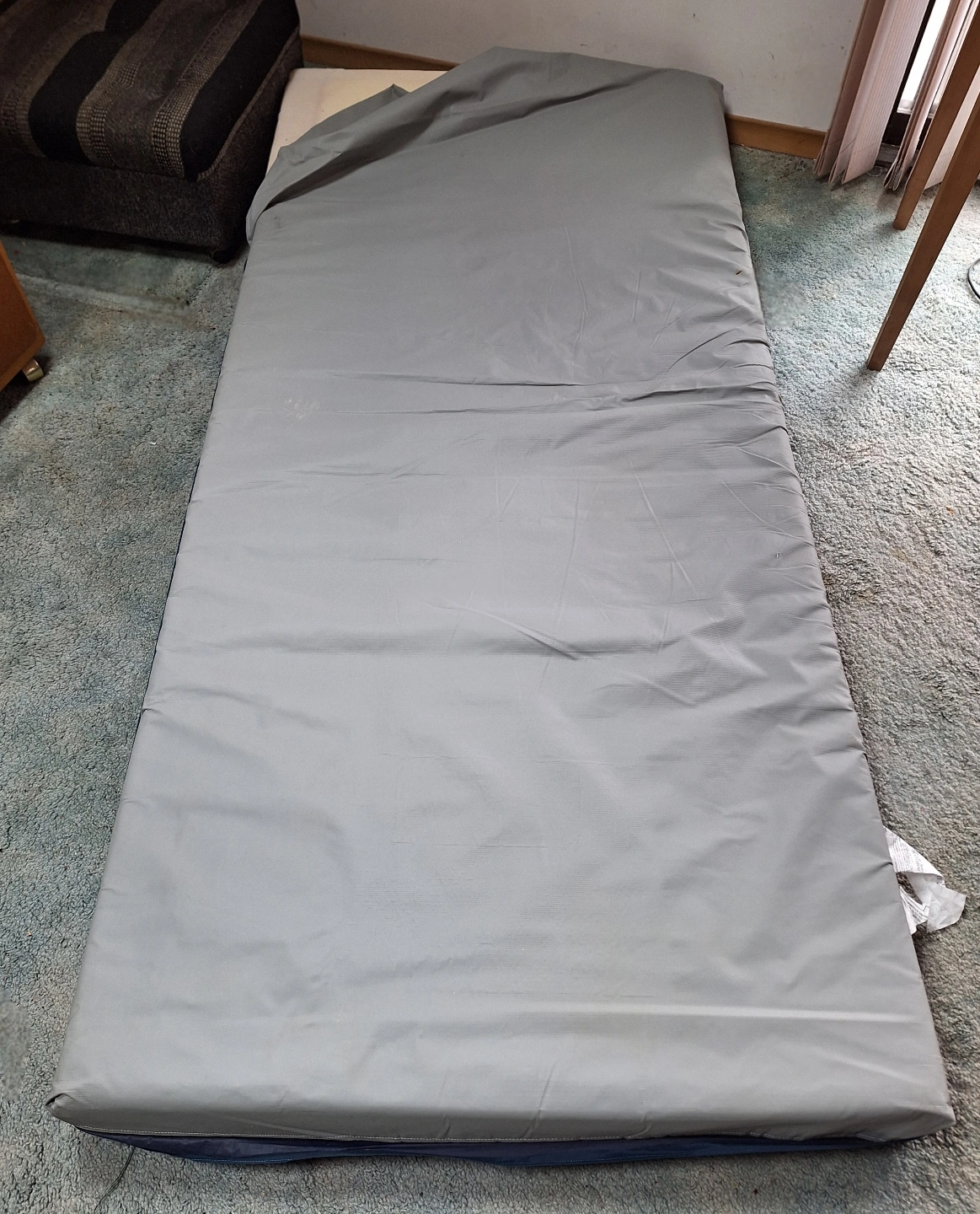Foam Mattress with grey protective cover Approximately twin size.