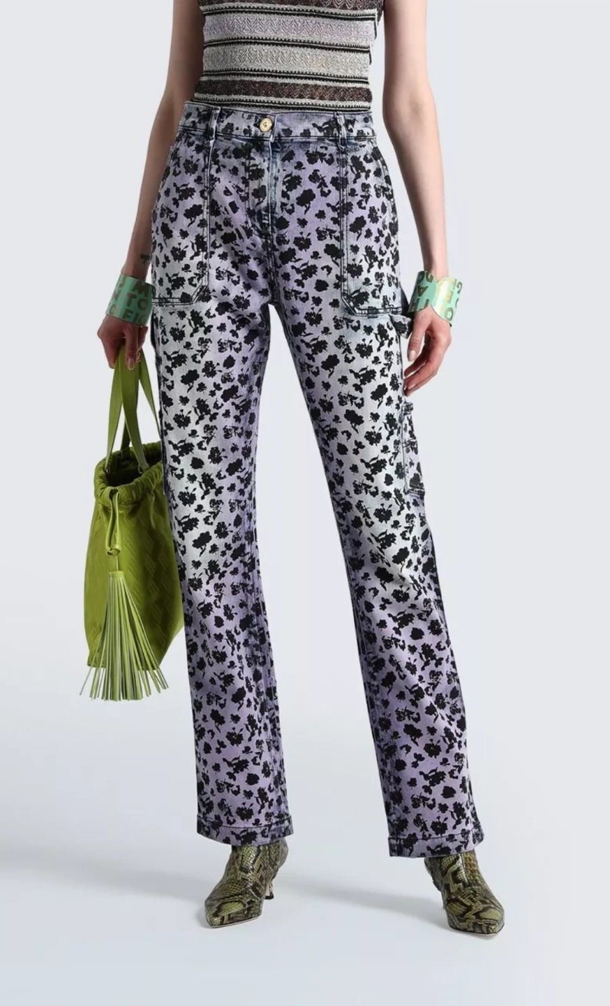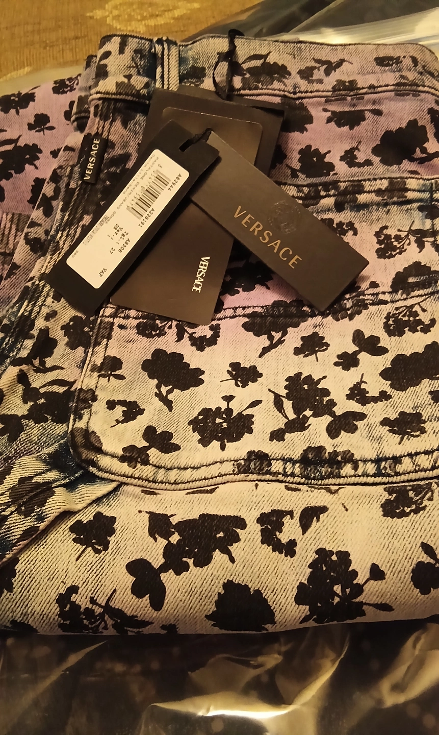 Authentic Women's Versace jeans. W31. Flared leg. Purple and blue floral print. High waist. Zip closure. Multiple pockets. Cotton blend. Made in Italy. Brand new. Regular retail price $1,526