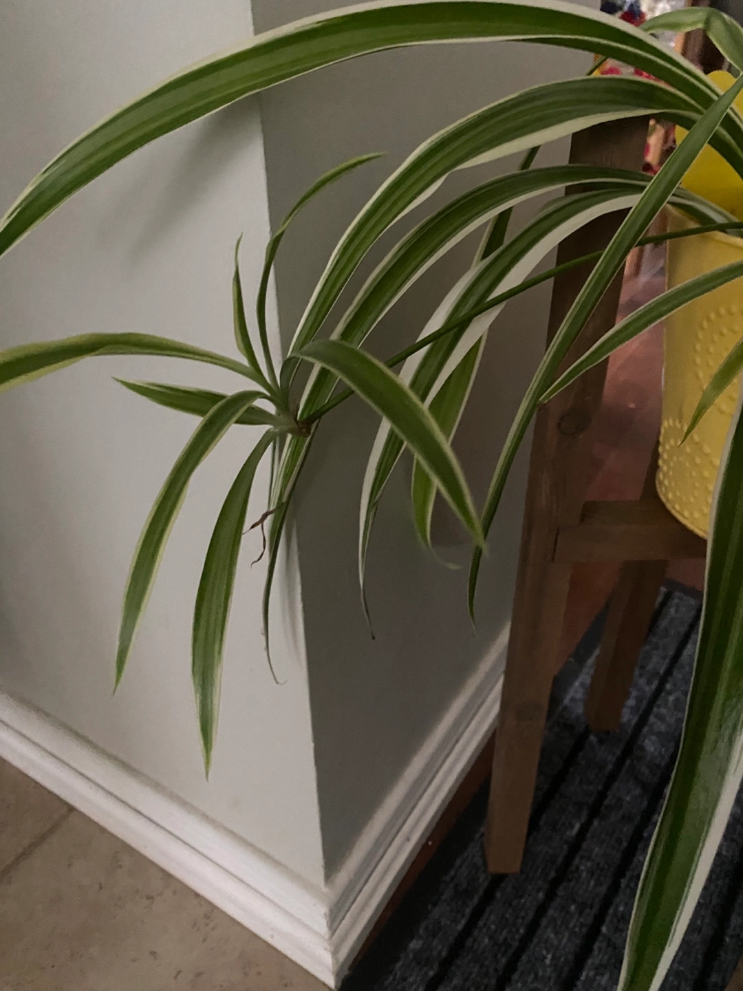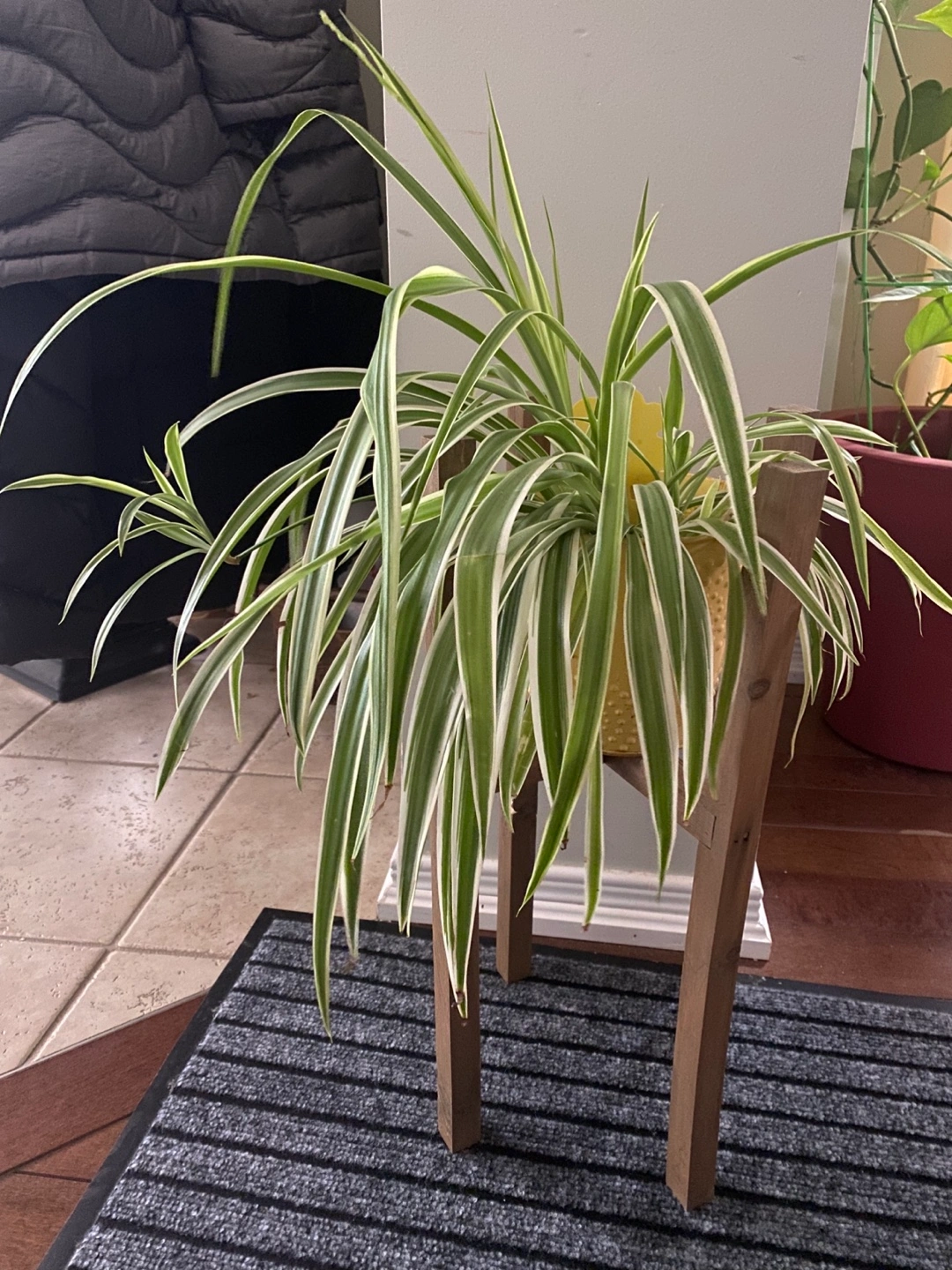 Large spider plant in a yellow pot. Healthy-looking foliage. Wooden stand not included. Will be showing more baby plants soon. Great addition to any home.