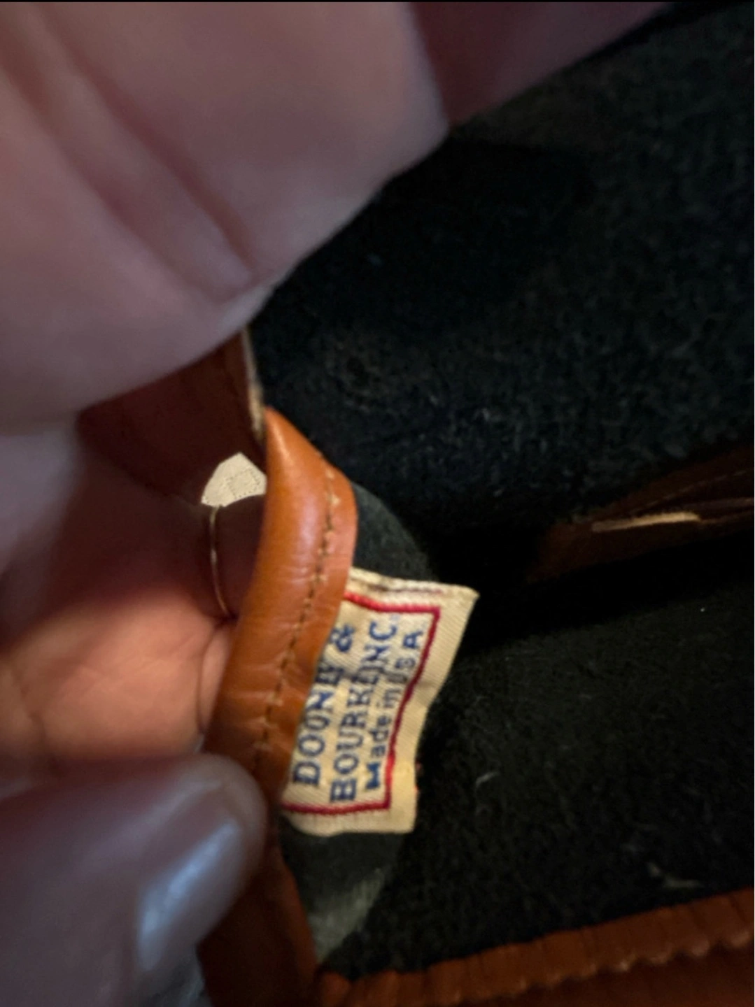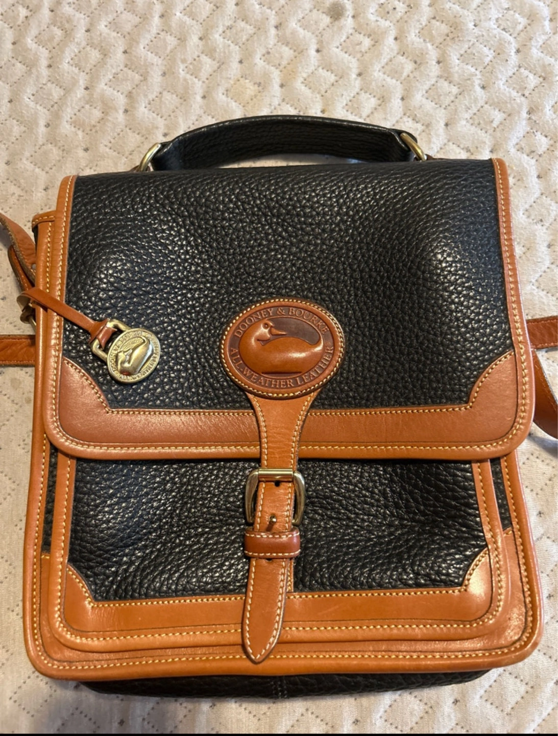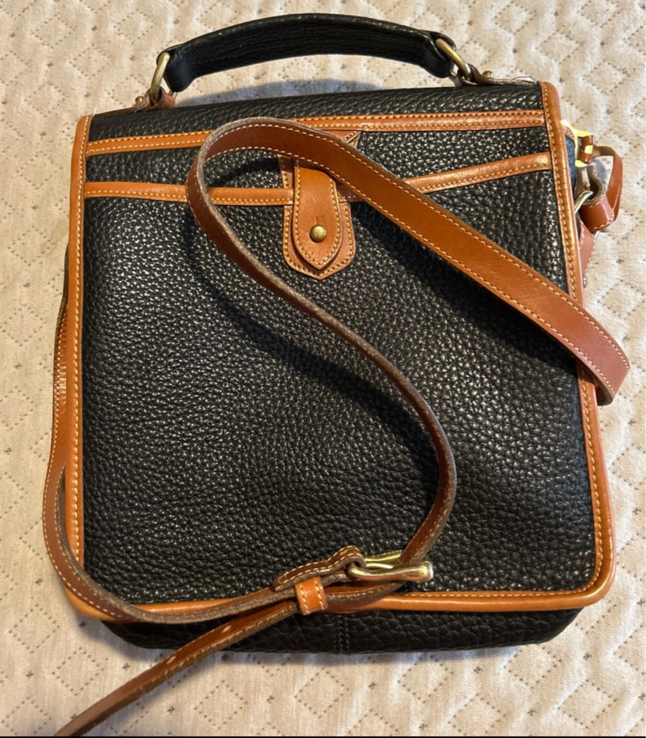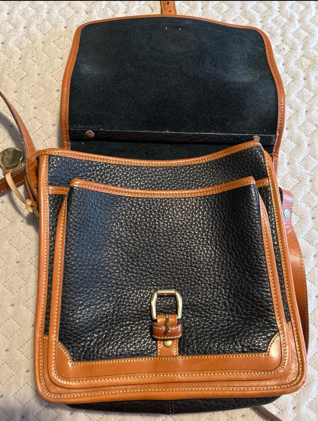 Black and tan leather crossbody bag. Adjustable shoulder strap. Multiple compartments. Made in the USA.