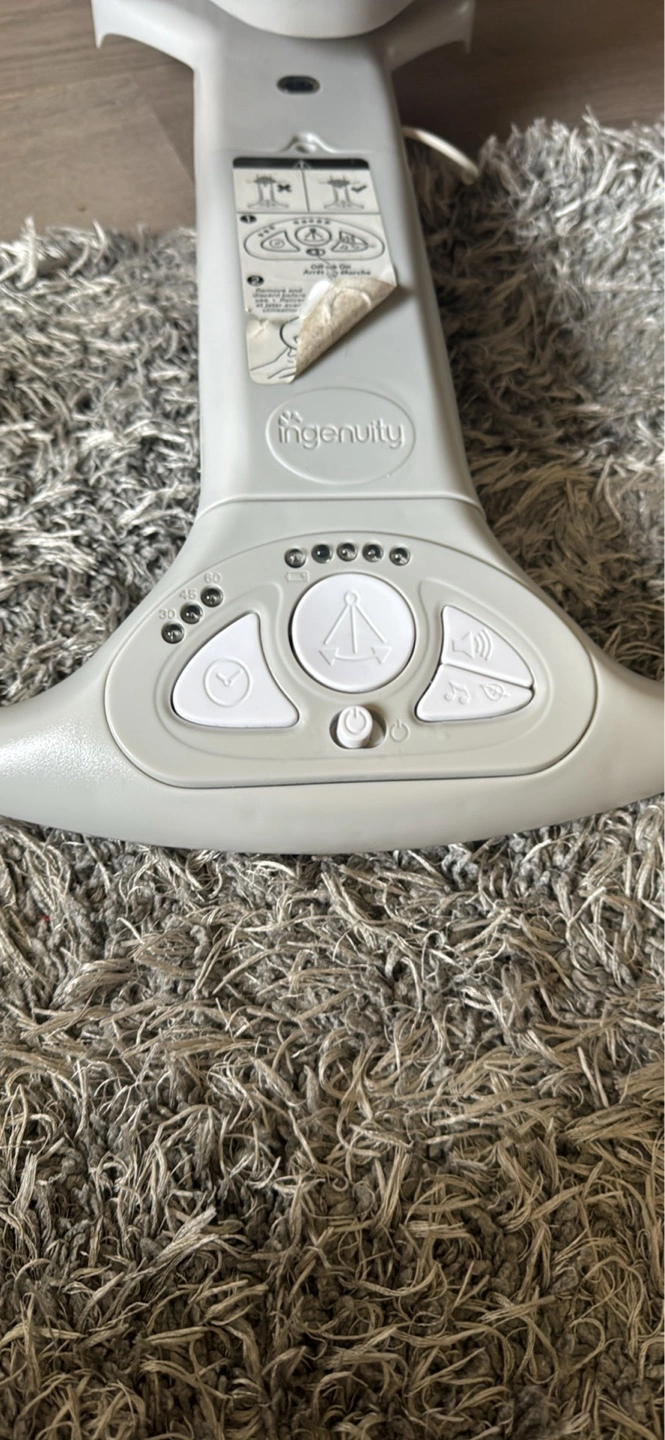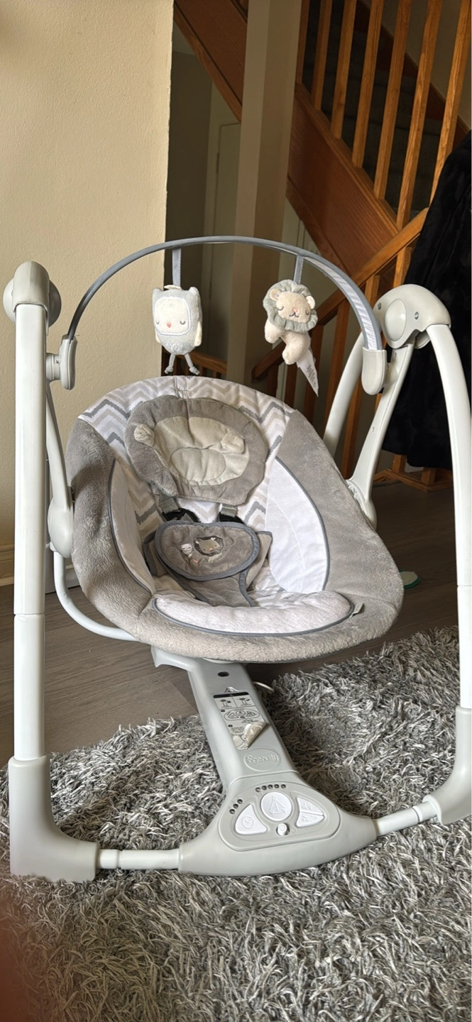 Grey and white baby swing. Features multiple speeds and soothing sounds. Includes adorable animal toys. Used but in good condition.