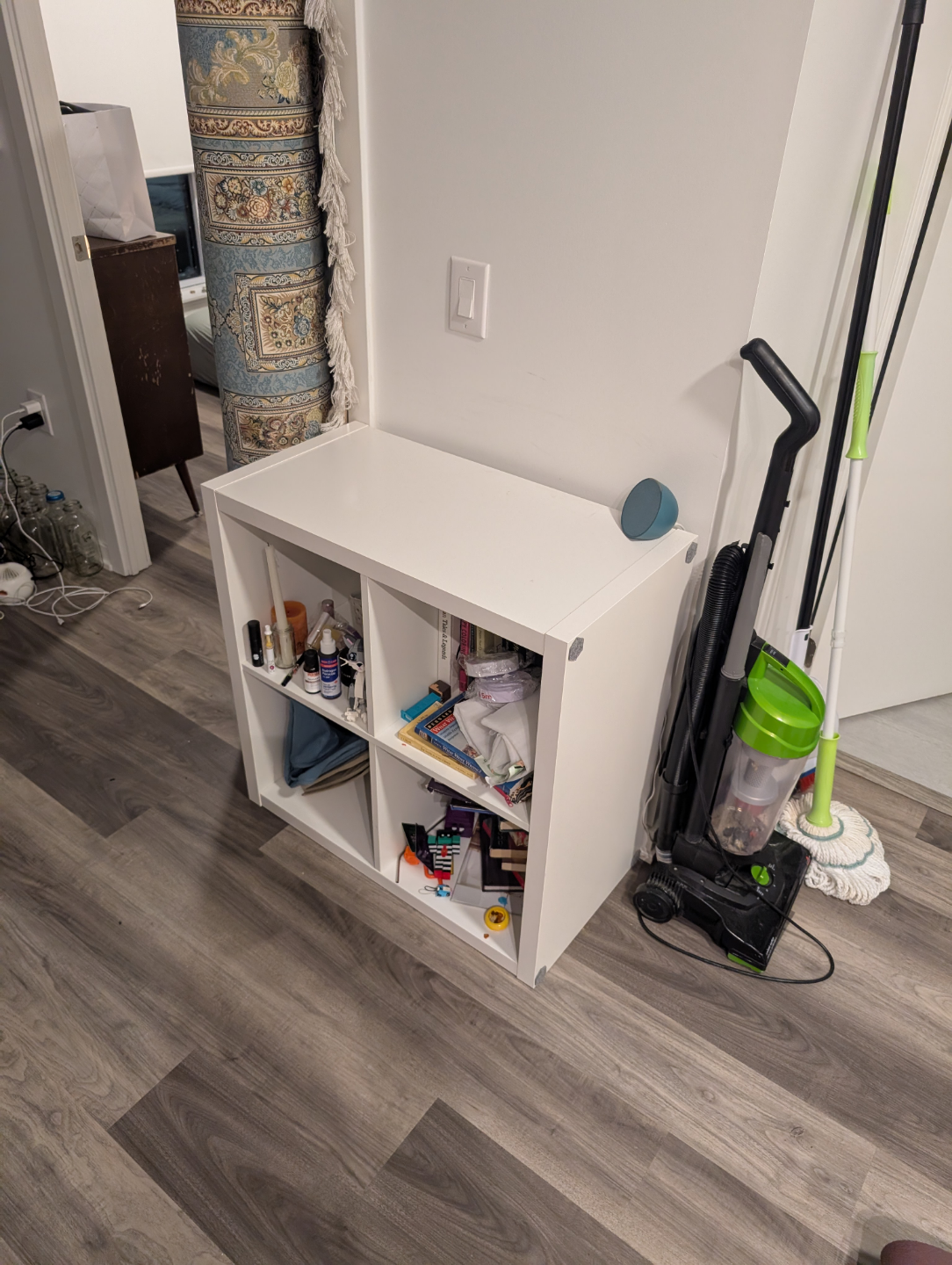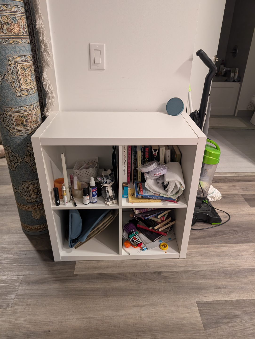 Four-cube organizer, great for small spaces. White finish. Some assembly required. Perfect for organizing books, toiletries, or other small items.