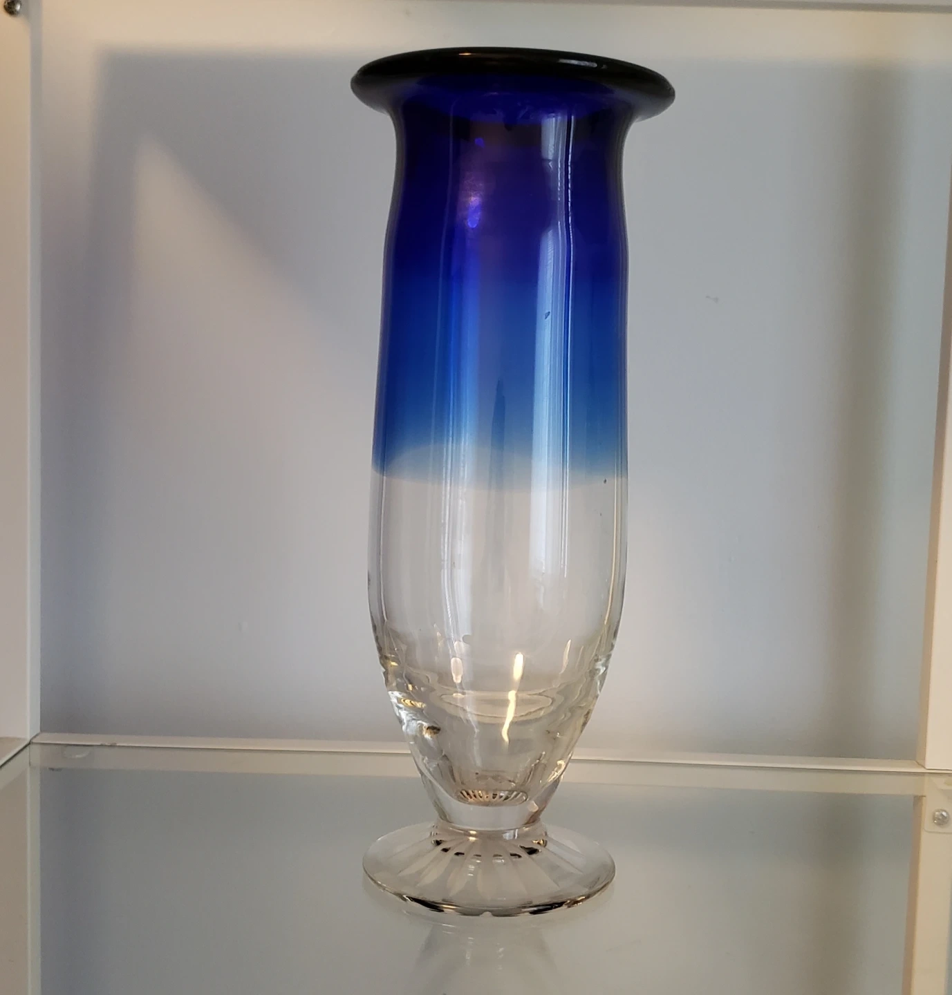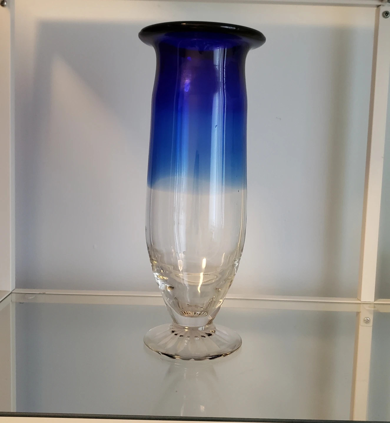 188Beautiful ombre glass vase. Features a vibrant cobalt blue top transitioning to clear at the bottom. Elegant pedestal base. Perfect for home decor.