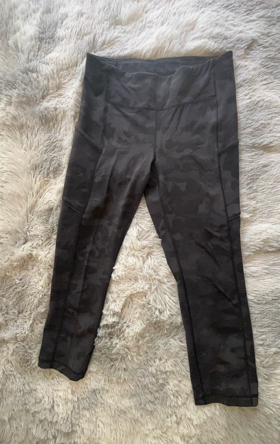 Black camo print. 7/8 length. High-waisted. Side pockets. Excellent condition.