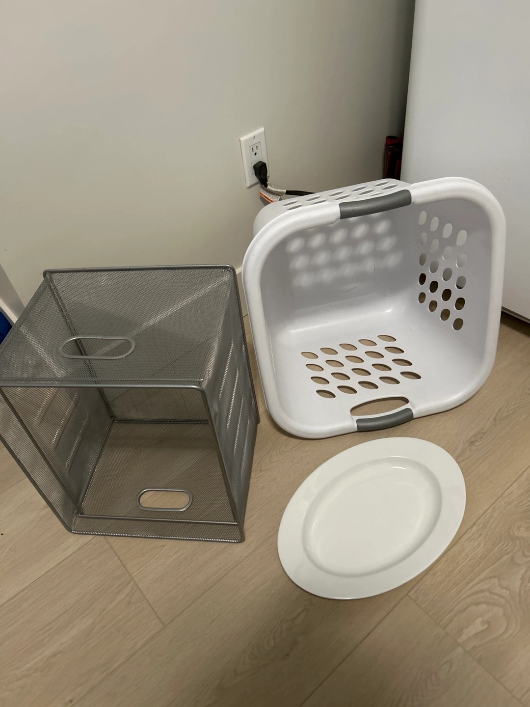 White plastic laundry basket. Grey metal organizer. White serving platter. Excellent condition.