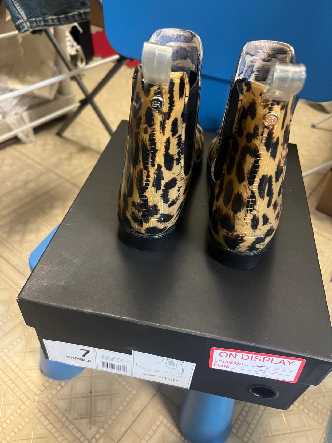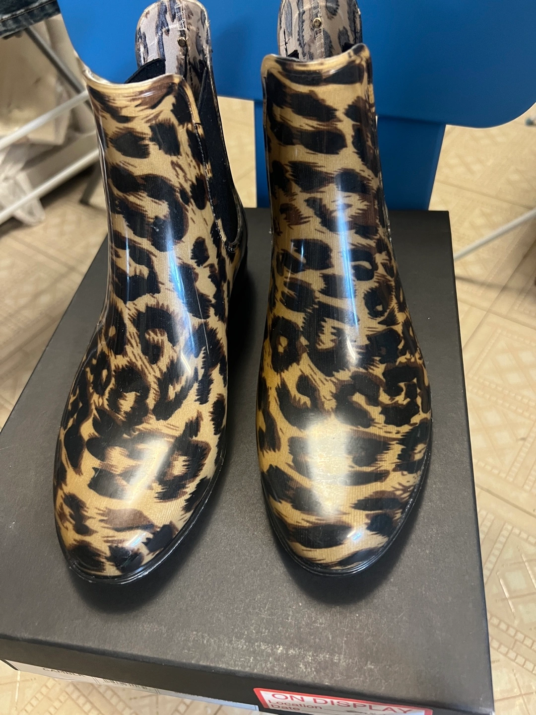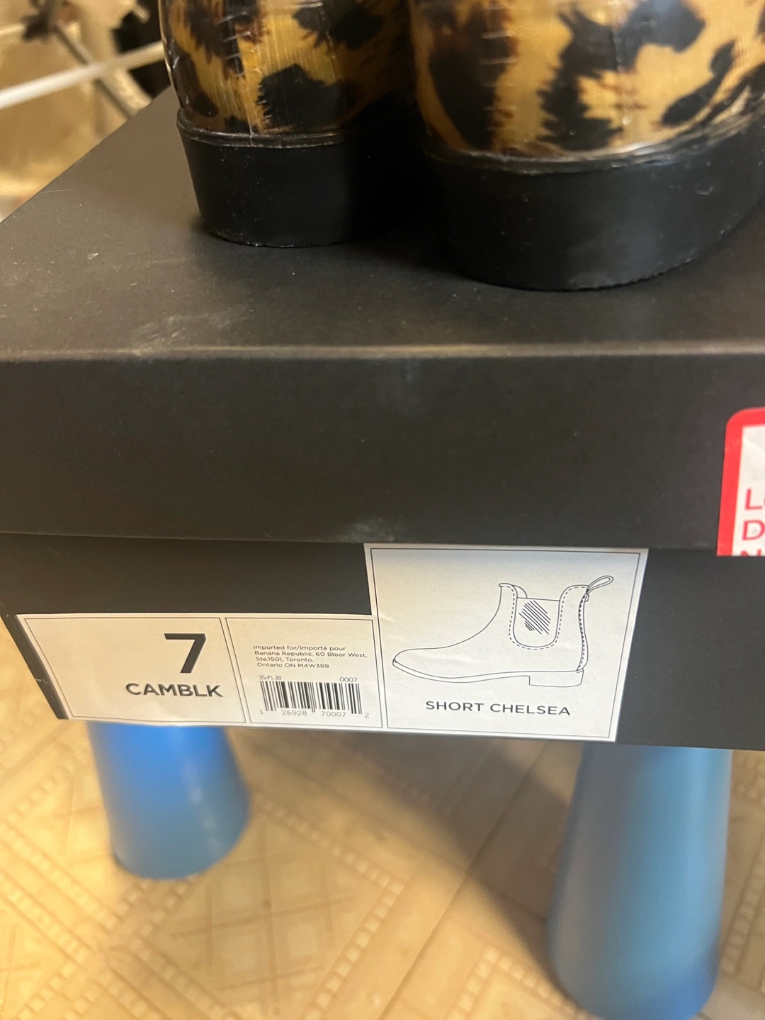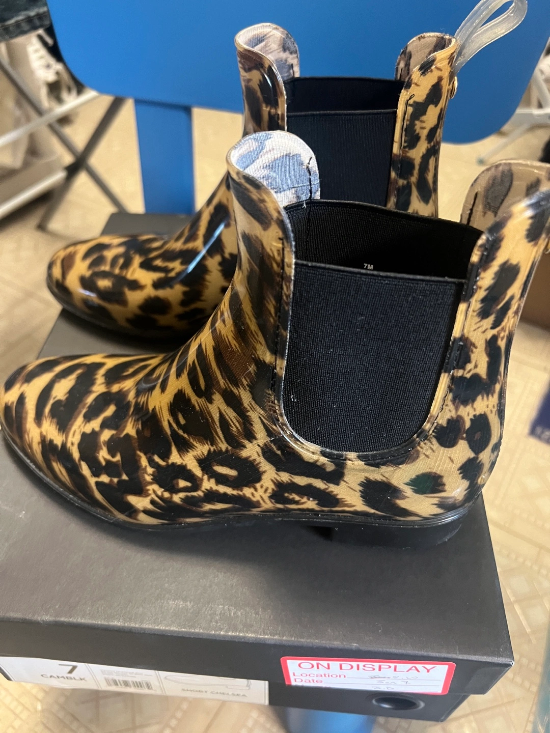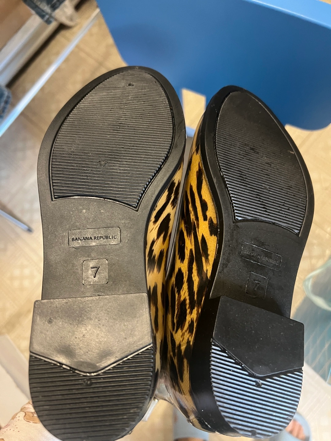 Women's size 7 Banana Republic rain boots. Leopard print design. Short Chelsea style. Comes in original box. Brand new in a box. Ideal for Spring time puddles Thank you