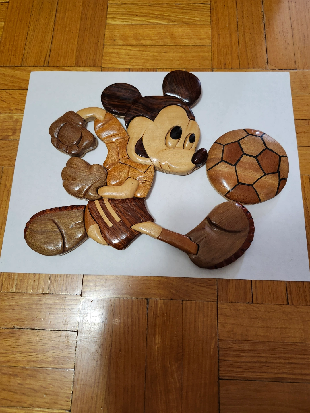 Handcrafted wooden wall hanging. Features Mickey Mouse playing soccer. Intricate detail. Unique piece. Wall mount included.
