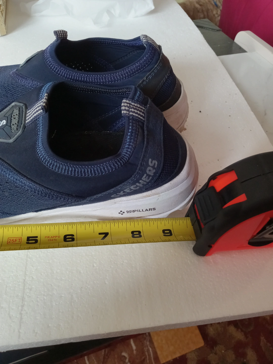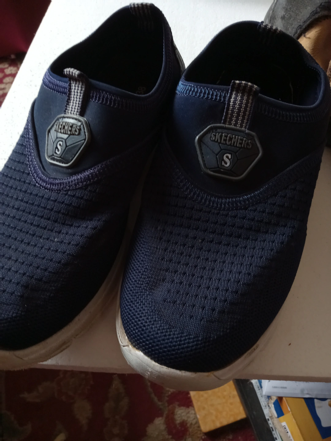 Lightly used Skechers slip-on sneakers. Navy blue fabric upper. Memory foam insole. Good condition, minor wear.