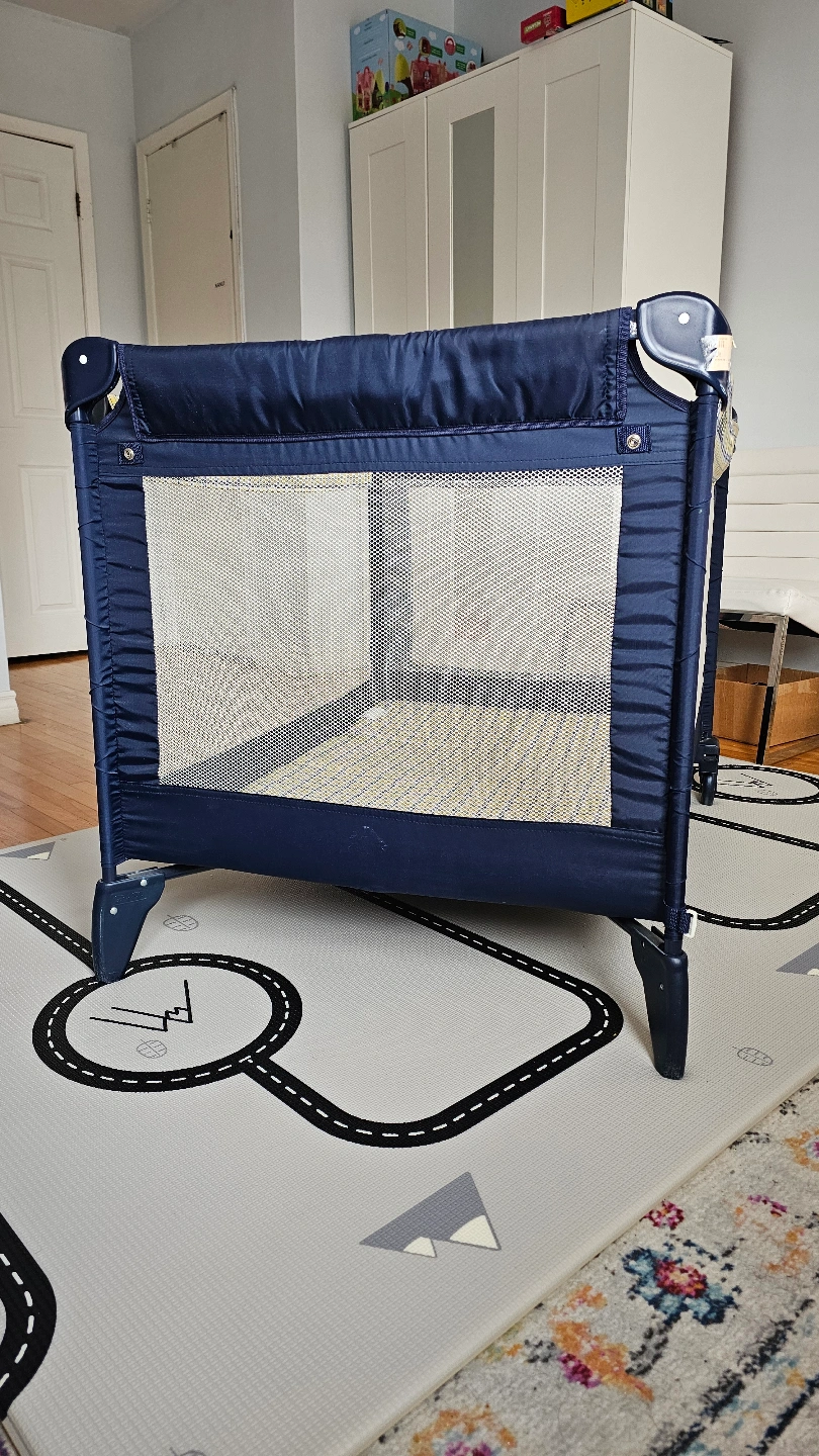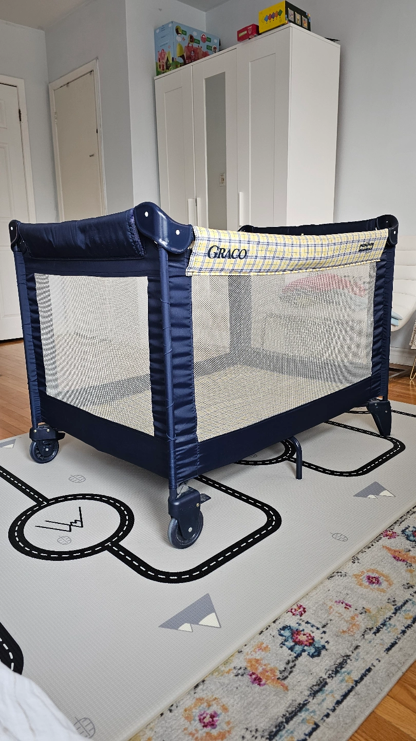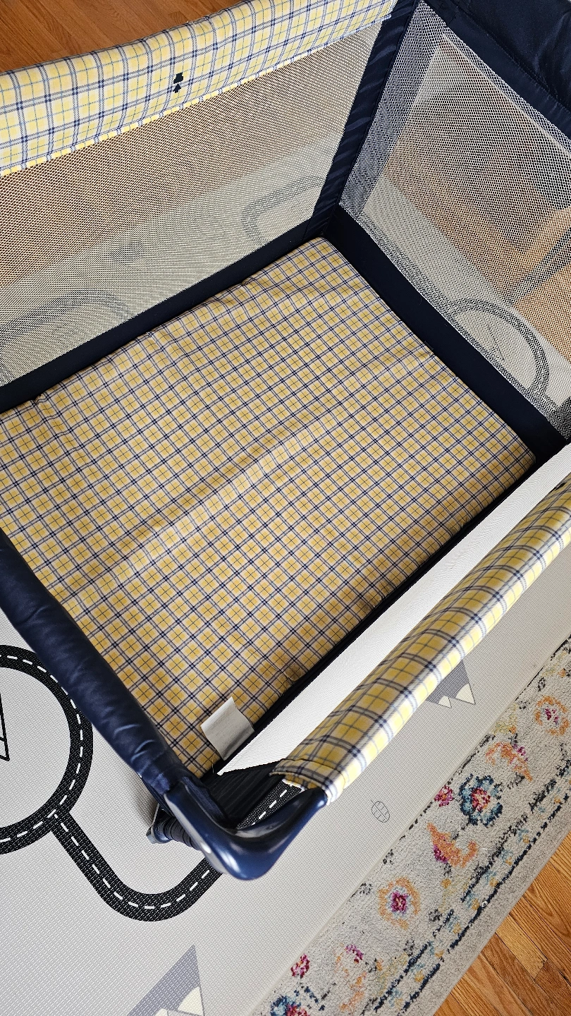 Portable playard, navy blue and yellow plaid. Includes a foldable mattress. Easy to assemble and store. Great for travel.