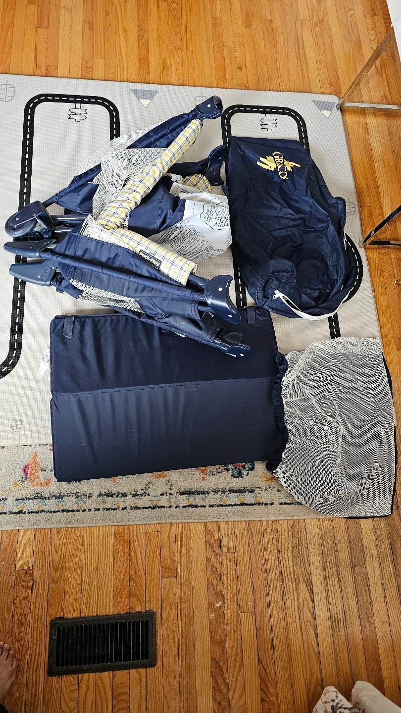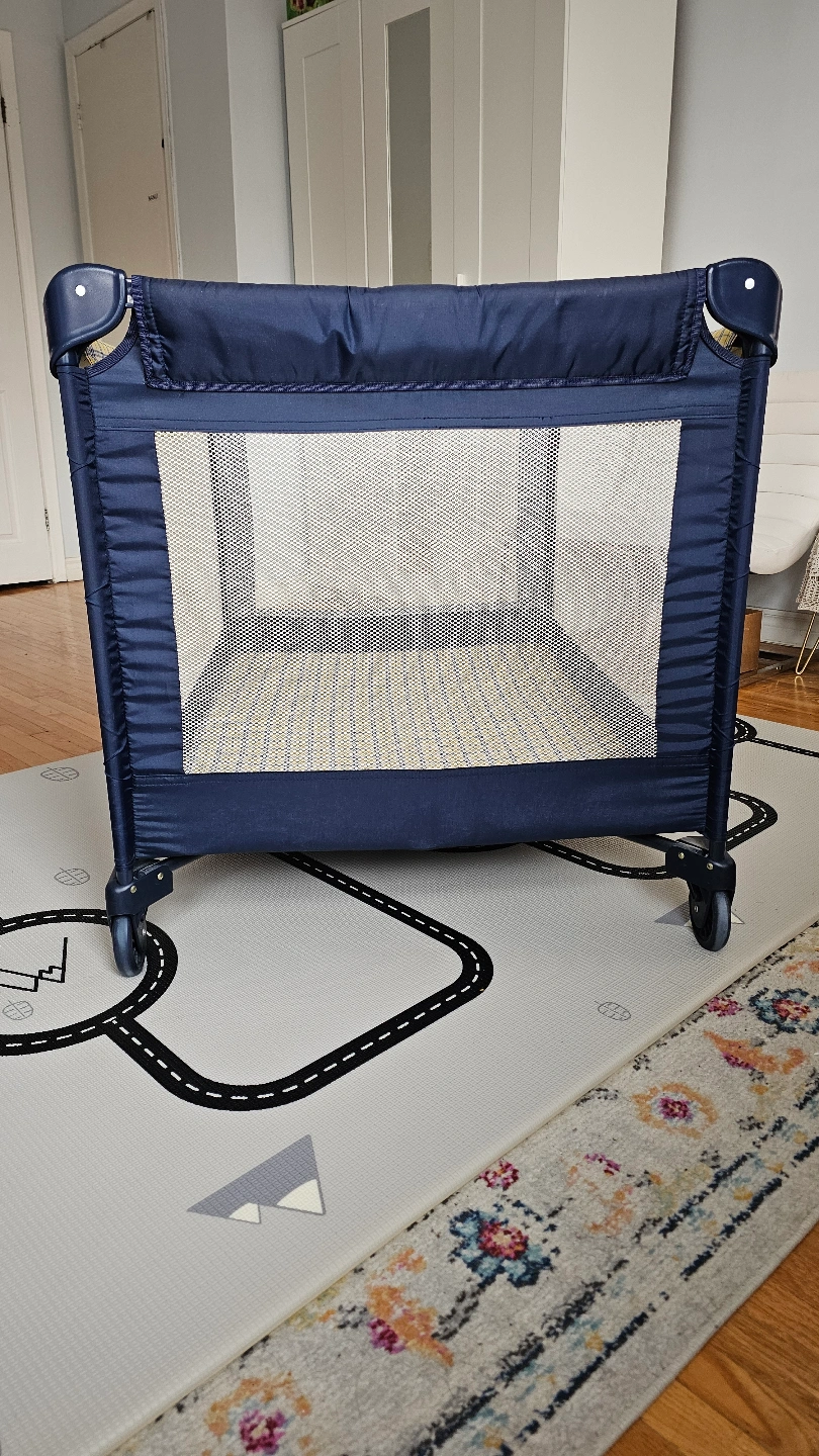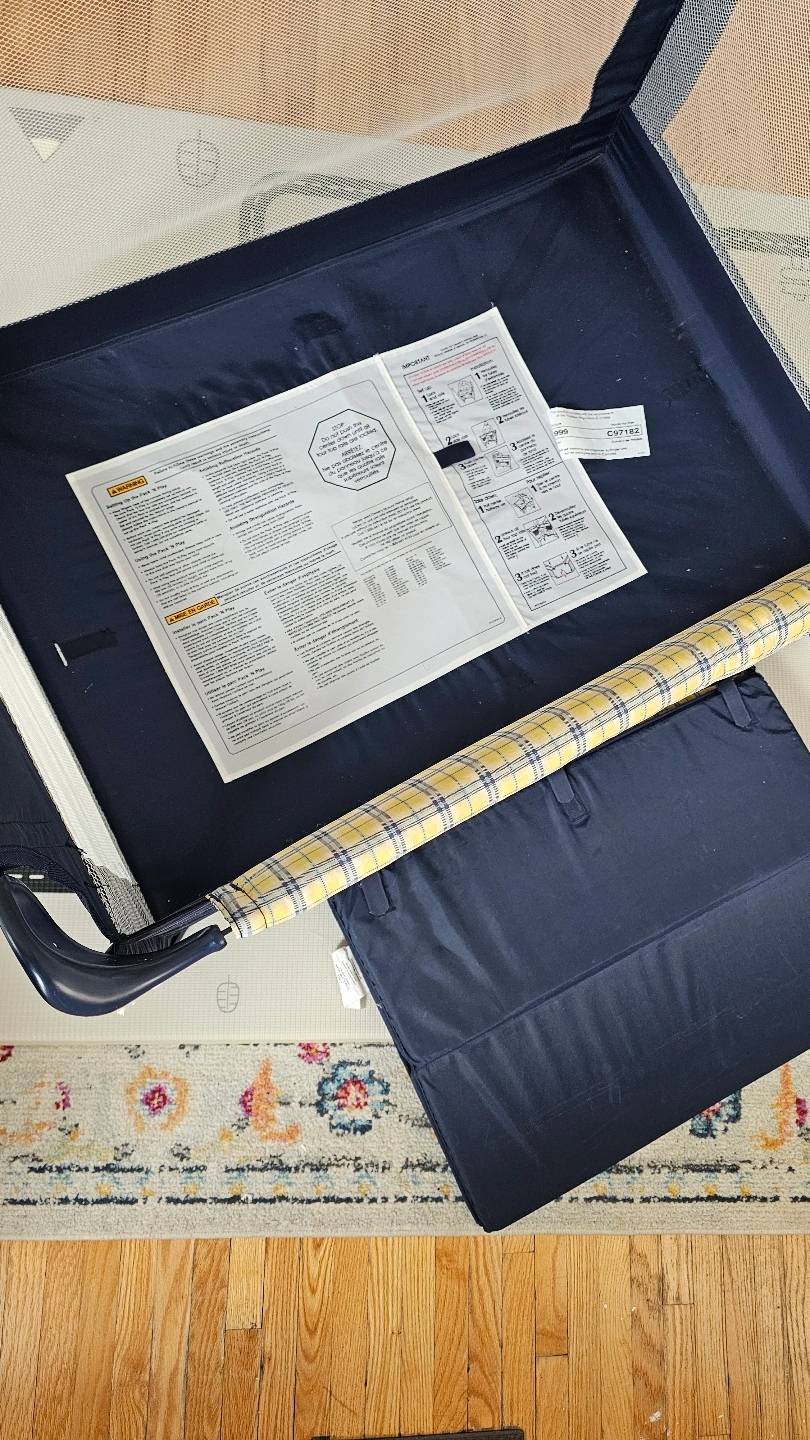Portable playard, navy blue and yellow plaid. Includes a foldable mattress. Easy to assemble and store. Great for travel.