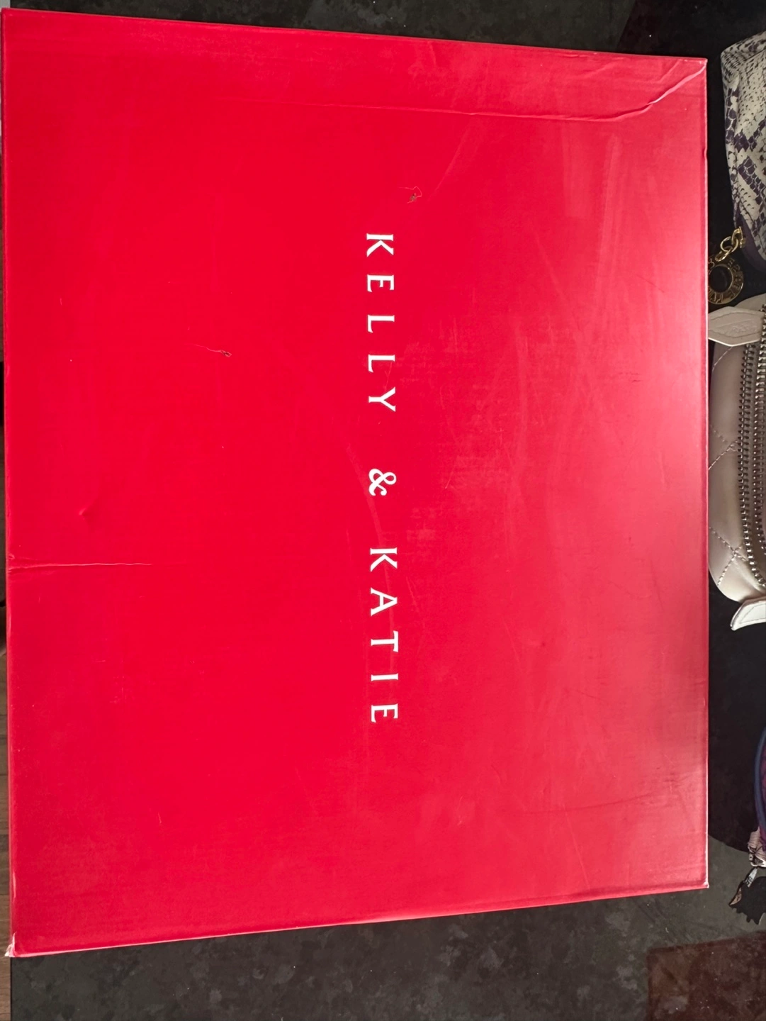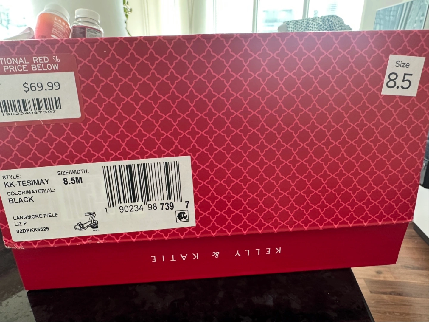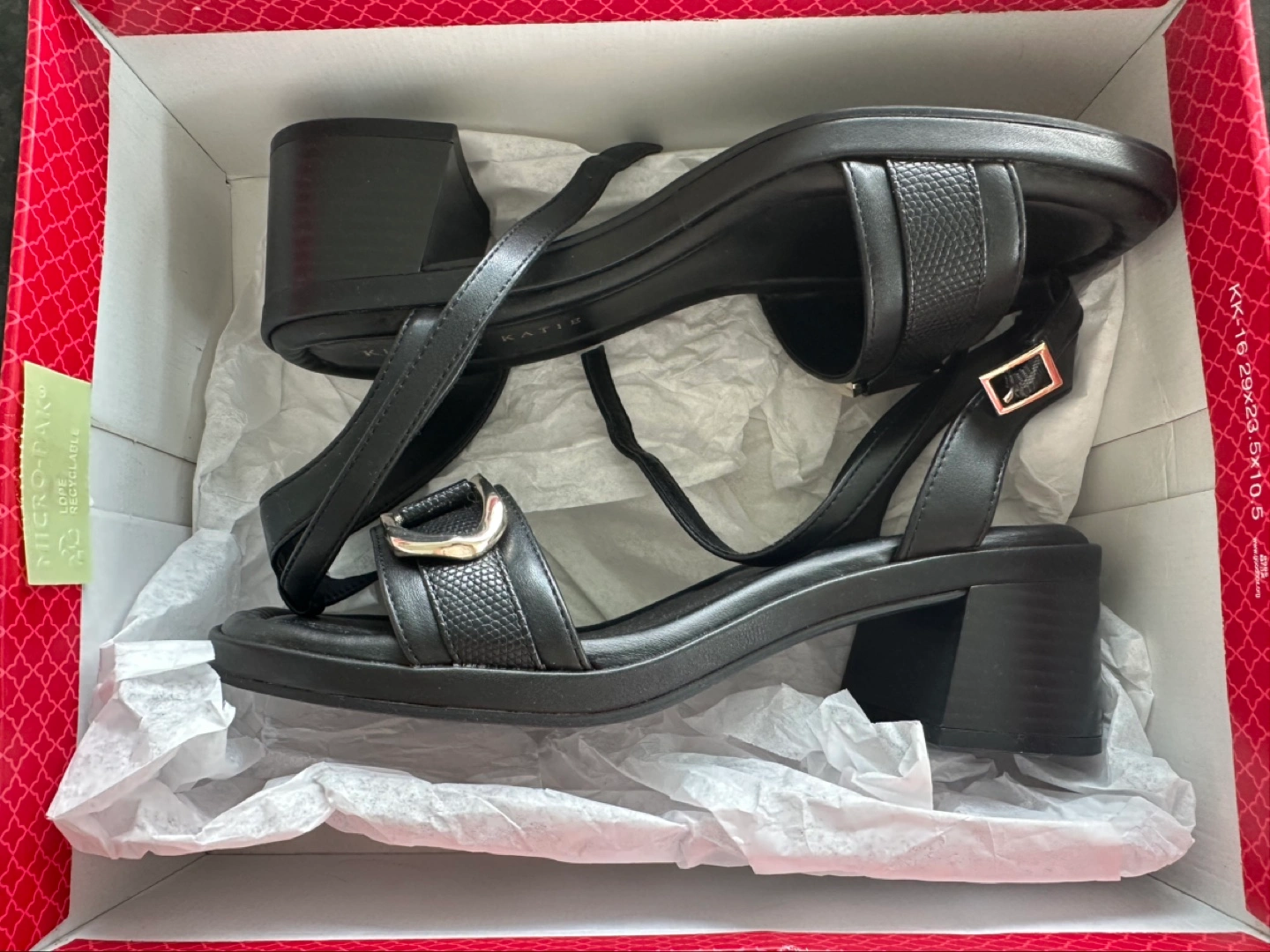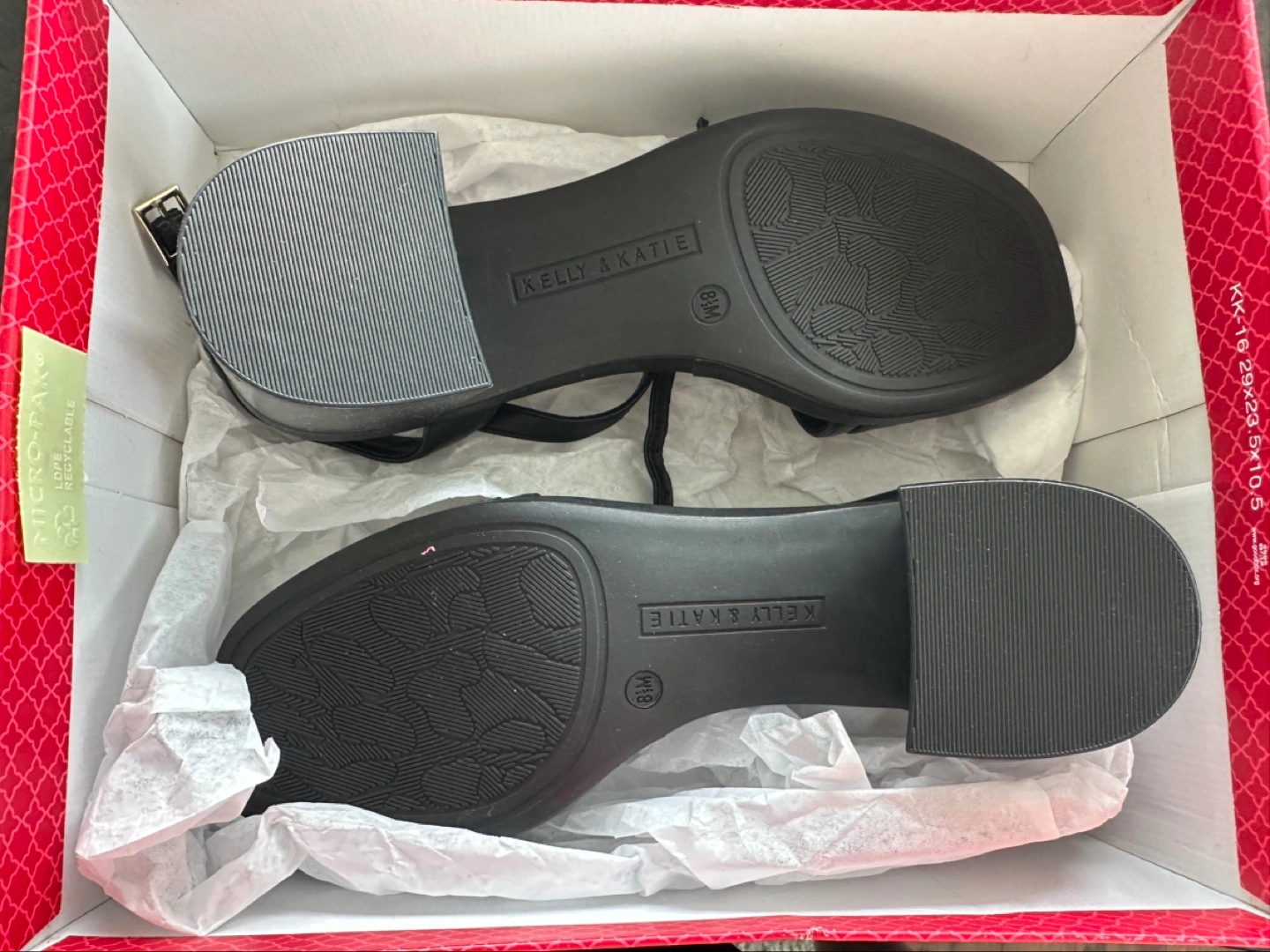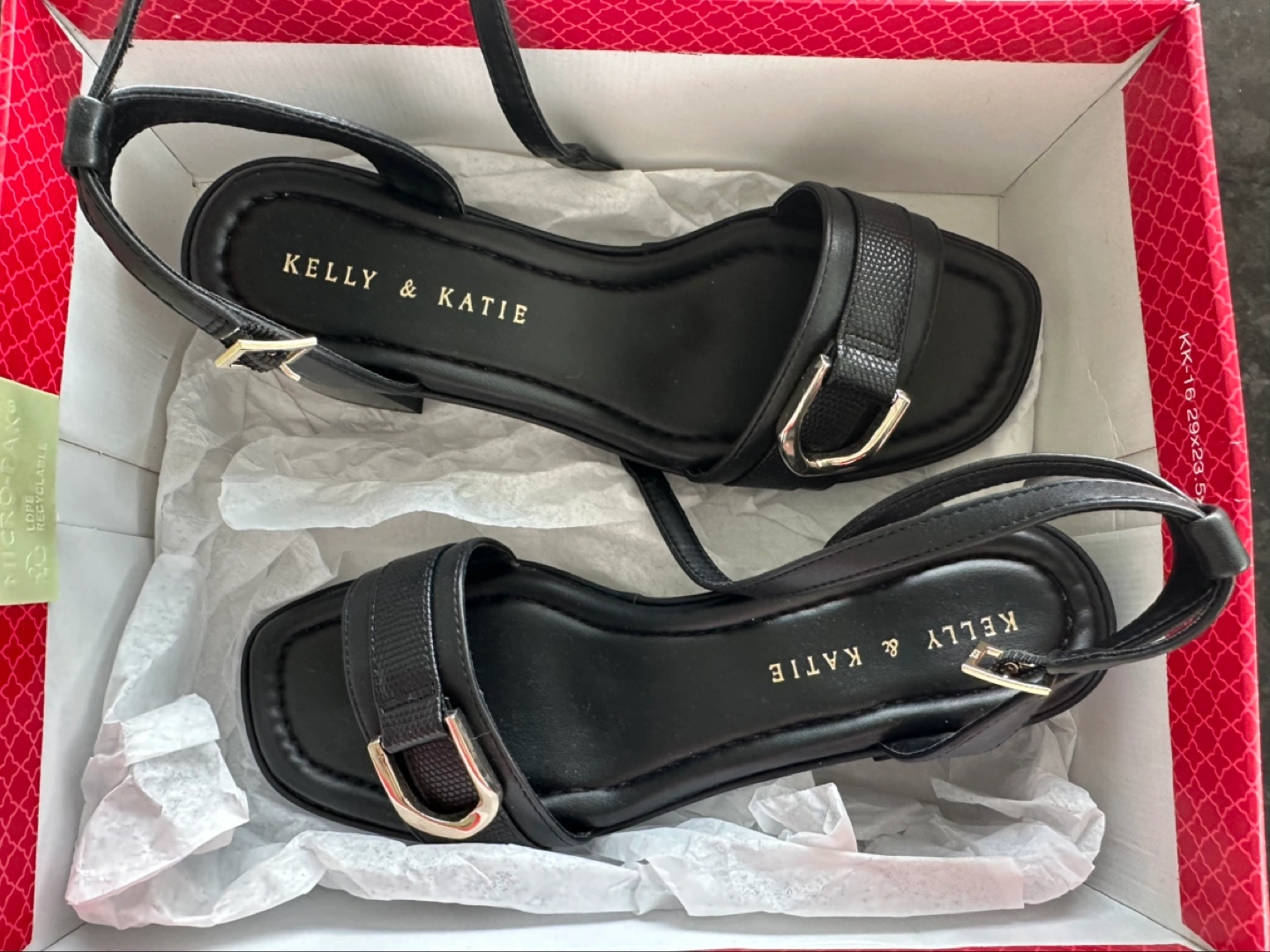 Brand new Kelly & Katie women's sandals. Size 8.5M. Black leather-look material. Block heel. Ankle buckle closure. Comes in original box.