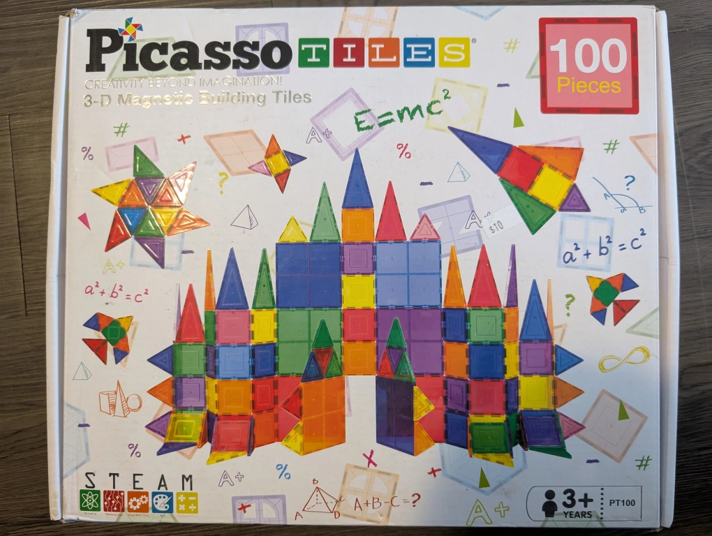 New, never opened, 100-piece magnetic building tile set. Great for creative building and learning. Suitable for children aged 3+. Includes various shapes and colours.