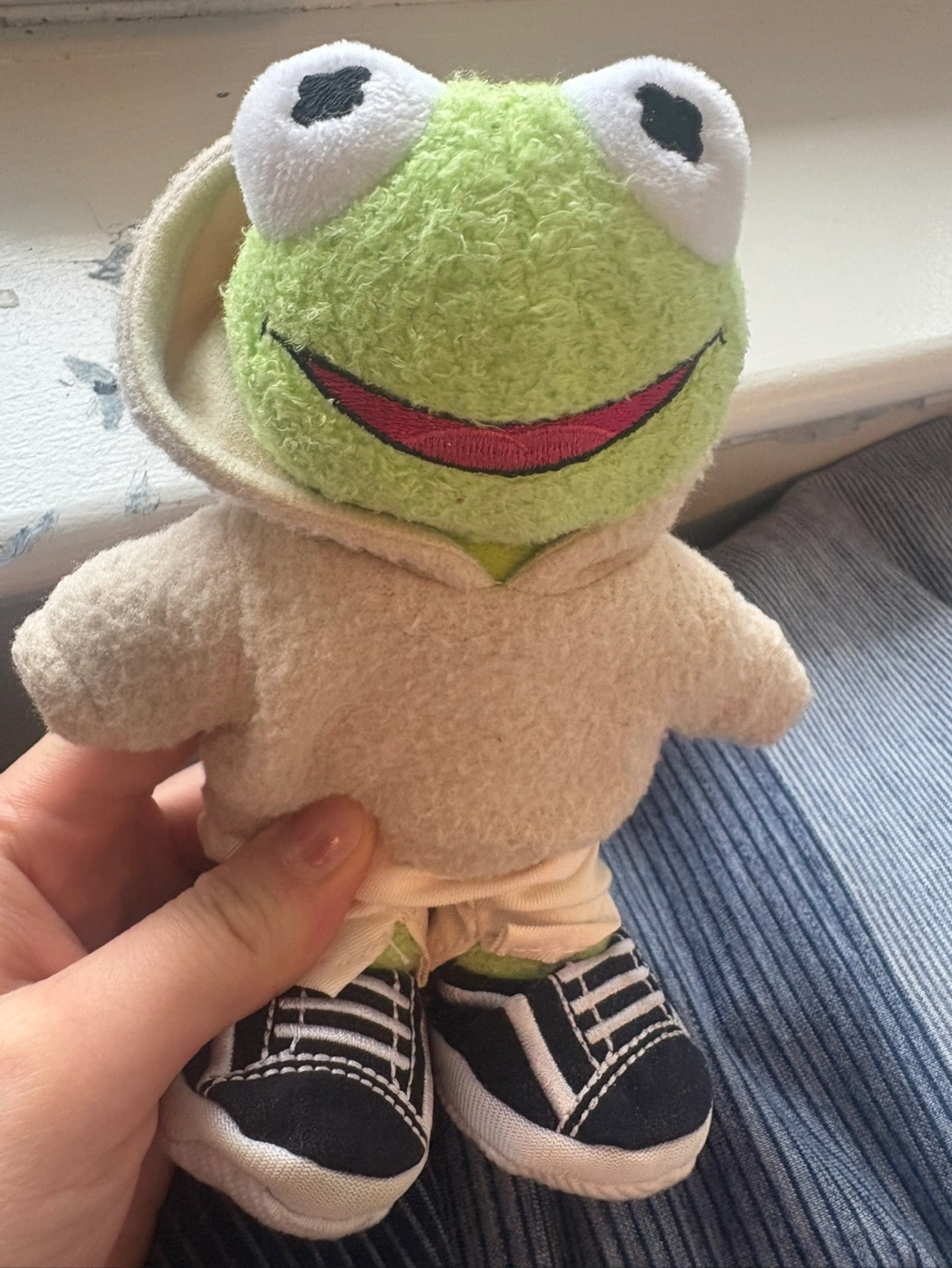 Kermit the Frog NUIMO. Wearing a tan hoodie and sneakers. Collectible and in great condition. No possible to buy anymore officially