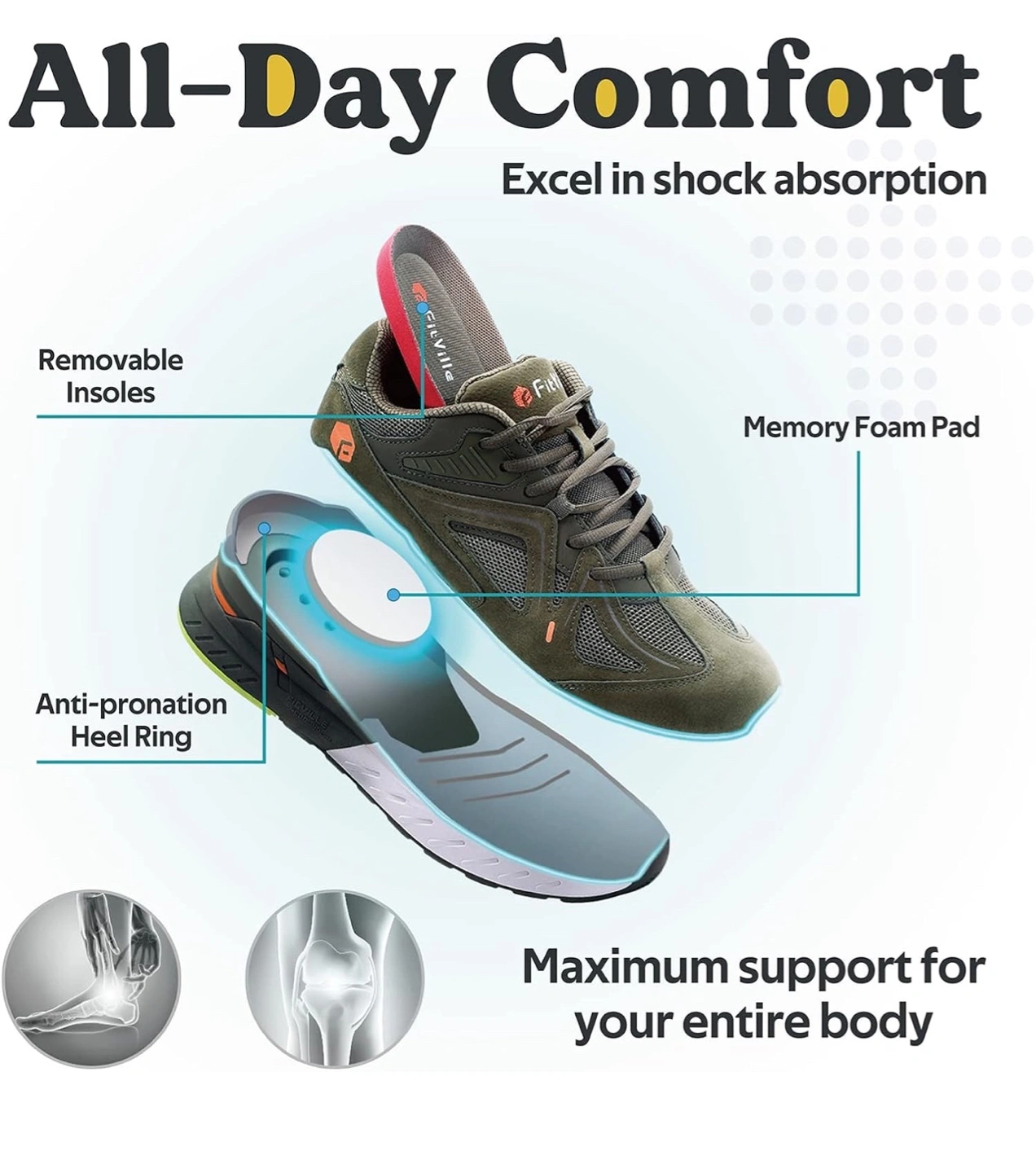 Comfortable walking shoes. Memory foam insole. Extra wide toe box design. Shock absorption. Great for all-day wear.