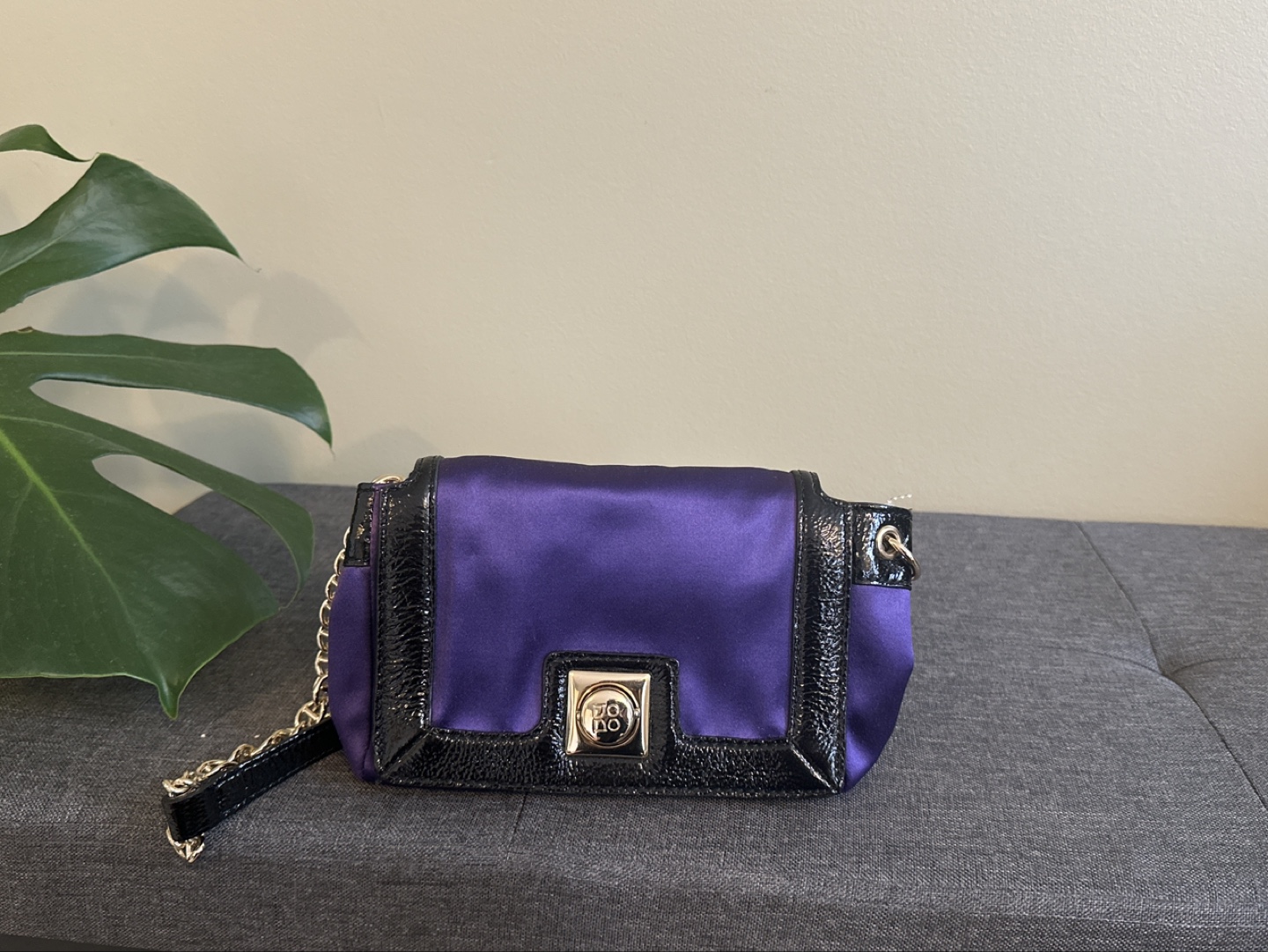 Small purple satin bag. Features a black patent leather trim and gold chain strap. Nice accent piece.