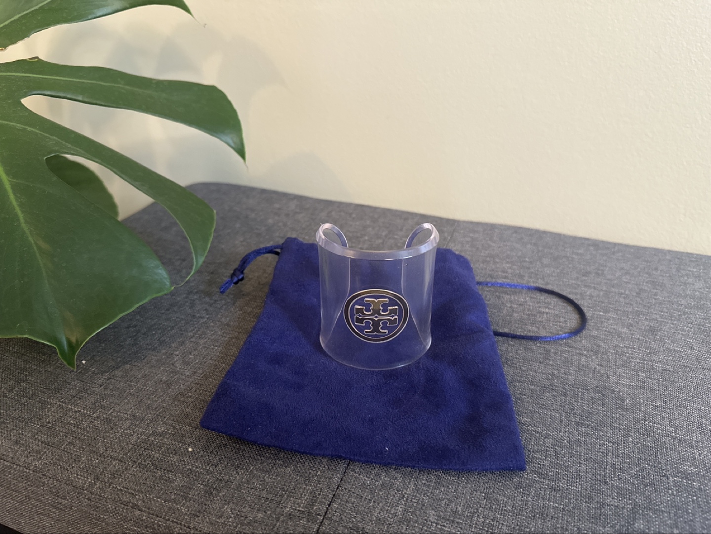 Gorgeous Tory Burch cuff bracelet. Clear acrylic with gold logo. Comes with a purple dust bag.