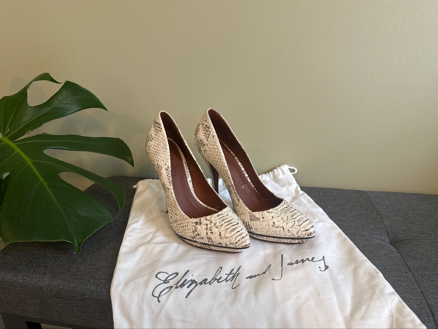 Pair of Elizabeth and James high heels. Snakeskin print. Pointed toe. High stiletto heel. Comes with dust bag. Fits more like a size 6.