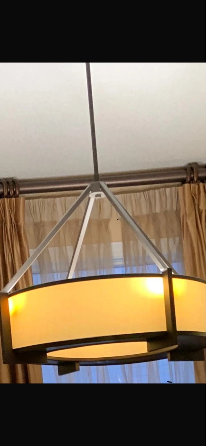 Beautiful semi-circular chandelier. Features a bronze frame and amber glass shade. Great for dining room or kitchen.