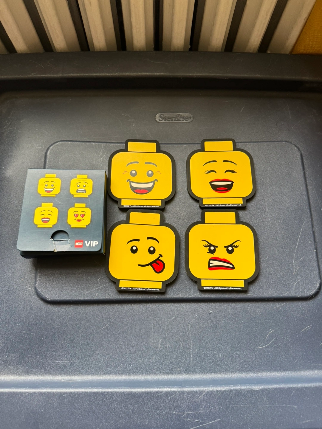 Four LEGO minifigure head coasters. Comes in original packaging. Fun collectible for LEGO fans.