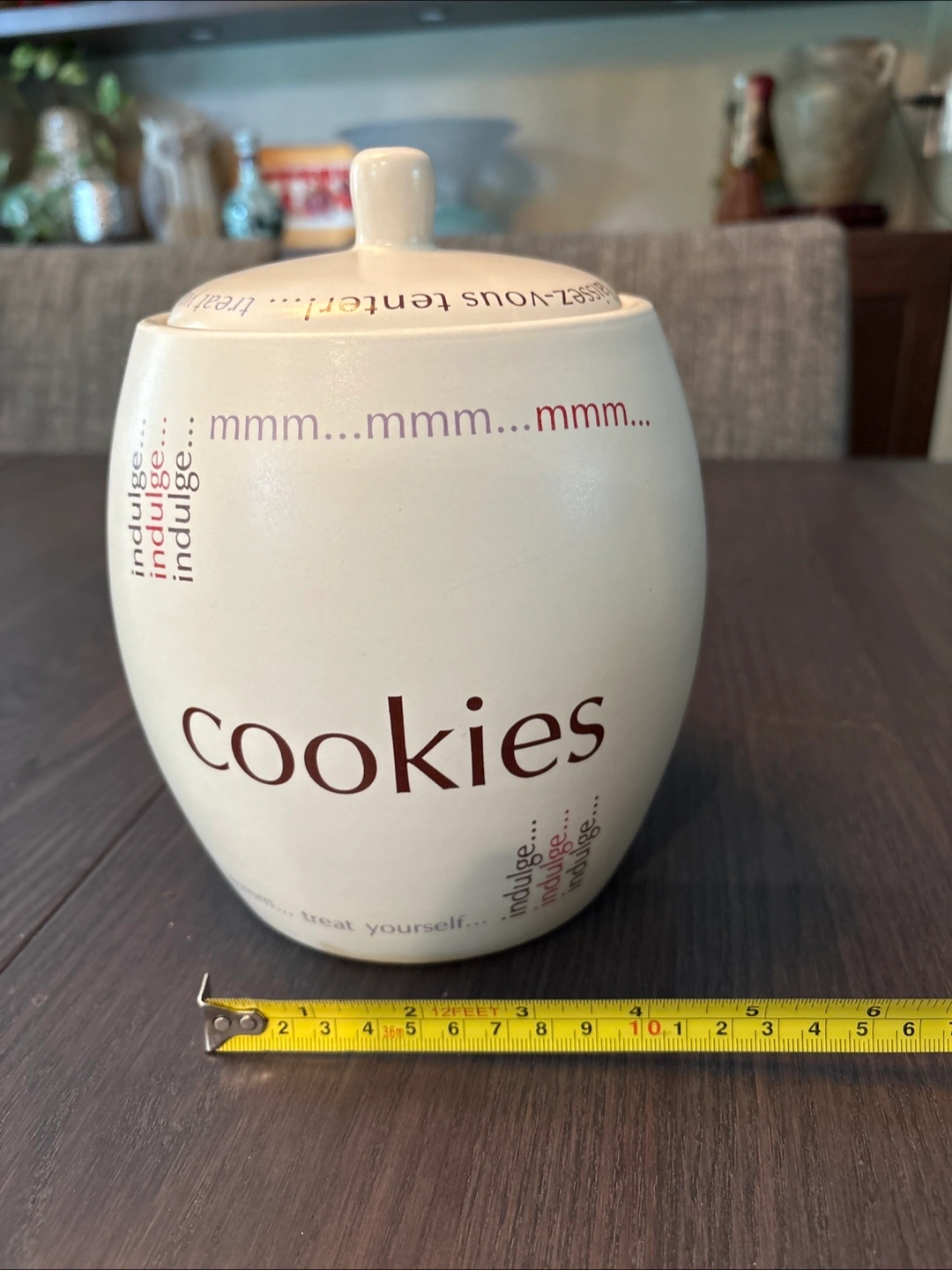 Adorable ceramic cookie jar. Features French and English text. Lid included. Cross-posted