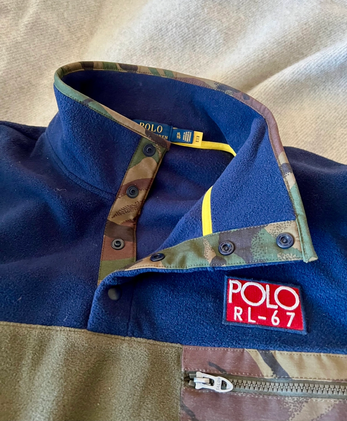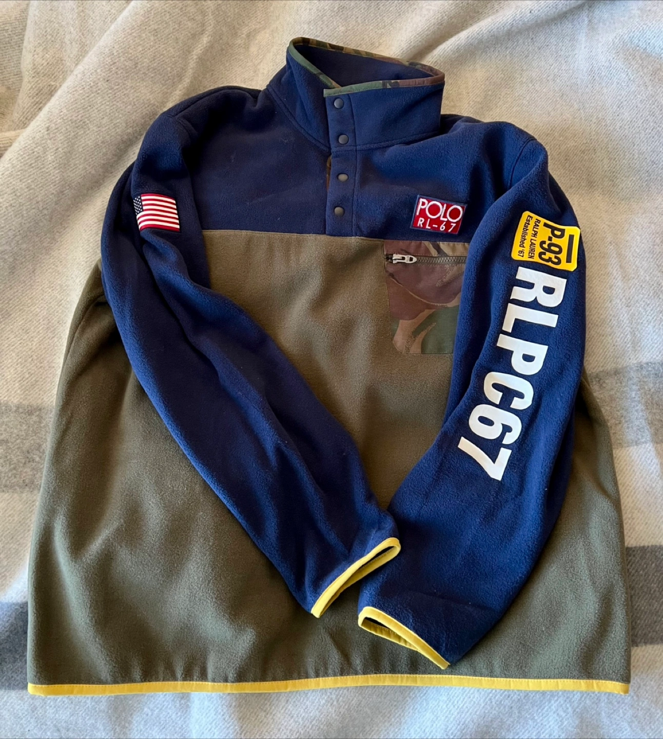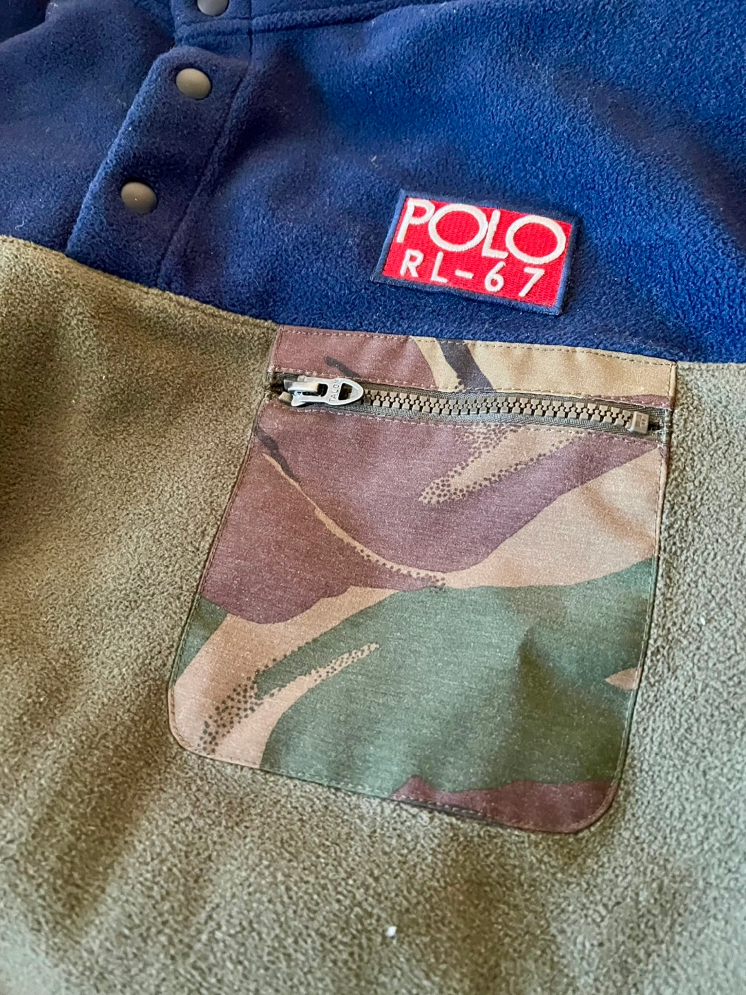 Men's Polo Ralph Lauren fleece pullover. Size XL. Features a two-tone colour block design, camo pocket, and snap button placket. Made in Cambodia.